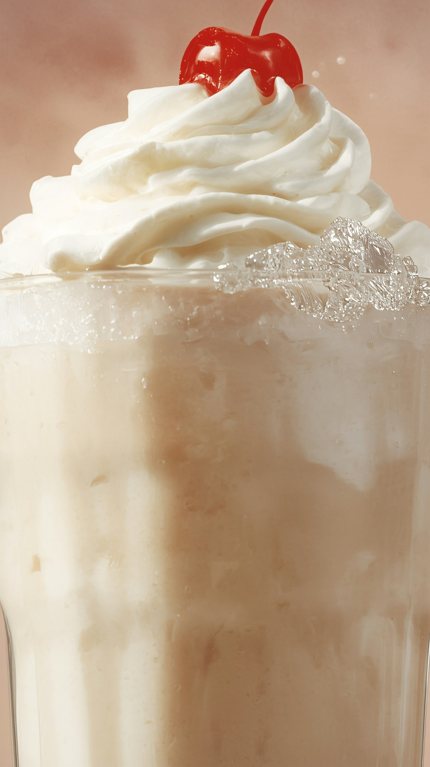 A creamy milkshake with whipped cream and a cherry on top, served in a frosty glass, perfect for a refreshing treat.