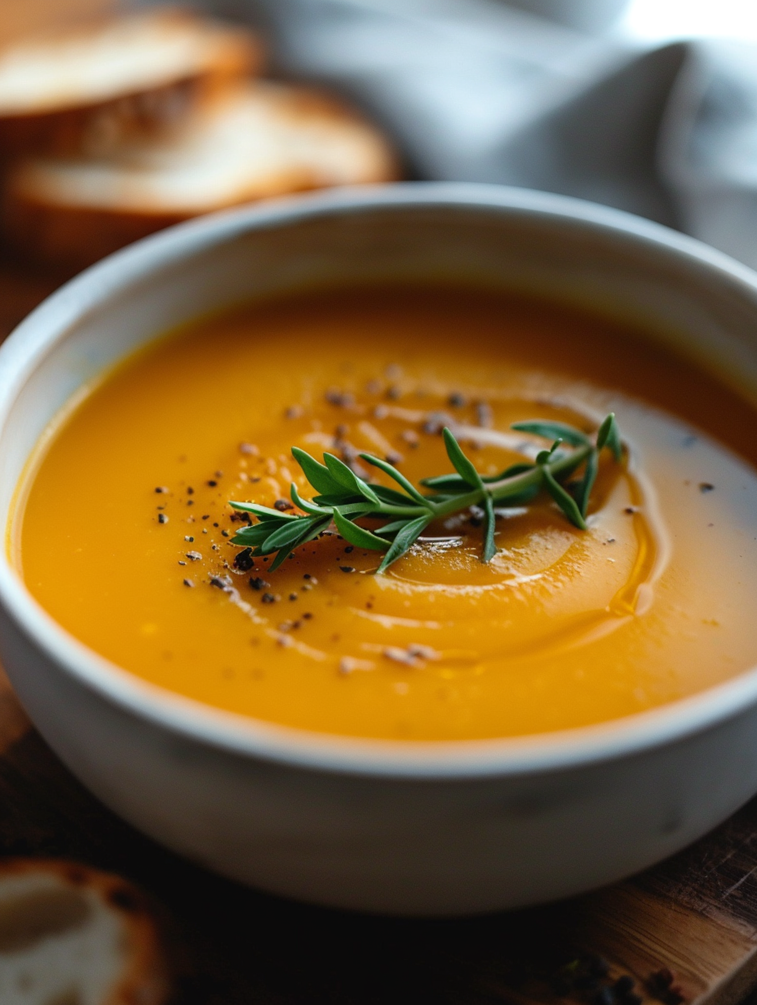 Creamy orange soup garnished with herbs and pepper in a white bowl, with bread slices in the background.