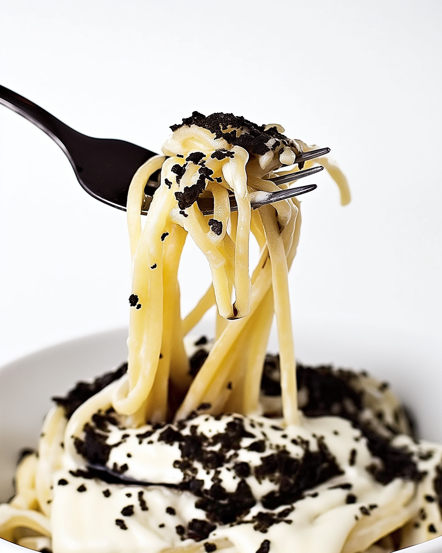 Creamy pasta topped with black truffle shavings, twirled on a fork against a clean white background. Perfect for food lovers!