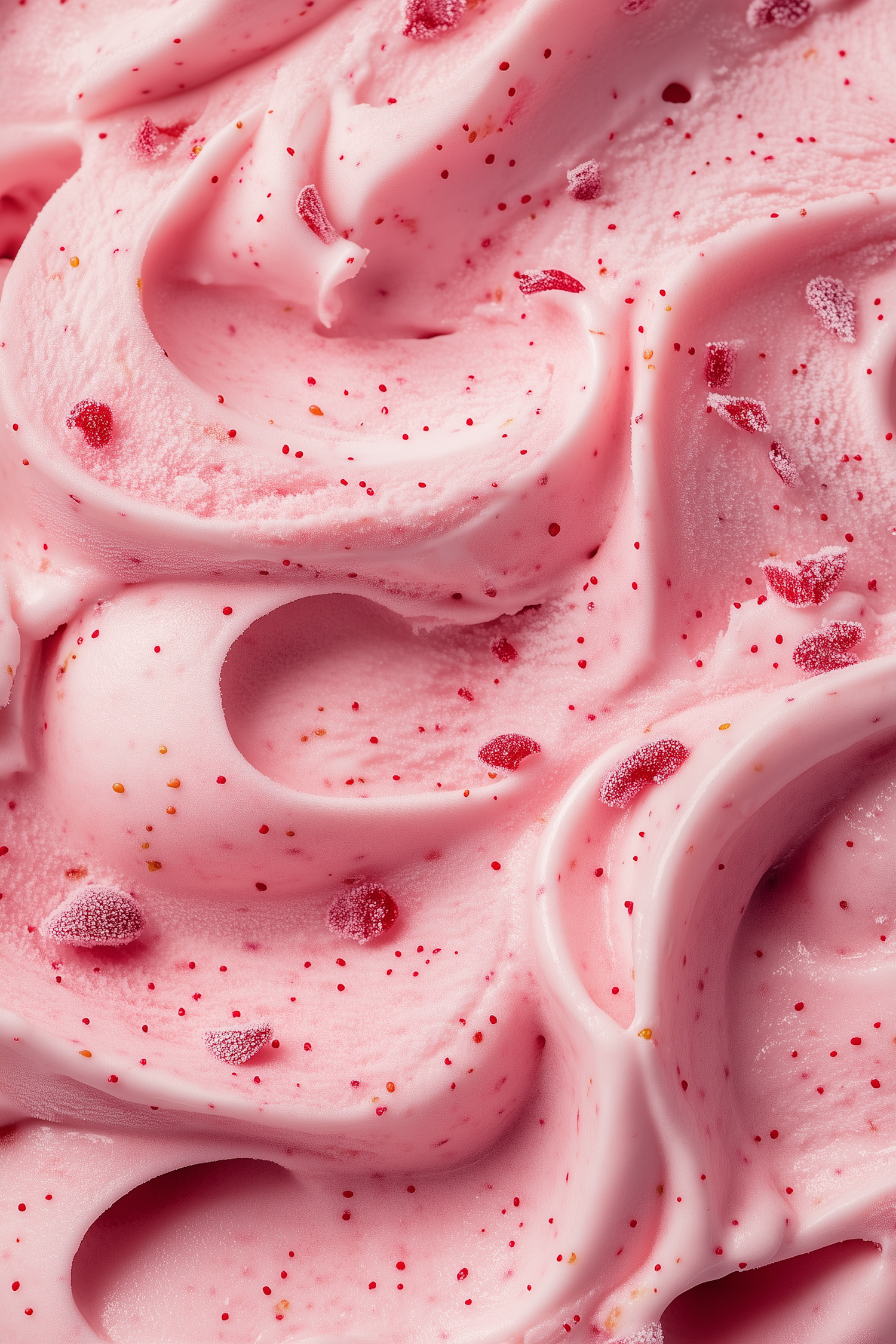 Close-up of creamy pink ice cream with red specks and frozen fruit pieces, showcasing a smooth, swirled texture and vibrant details.