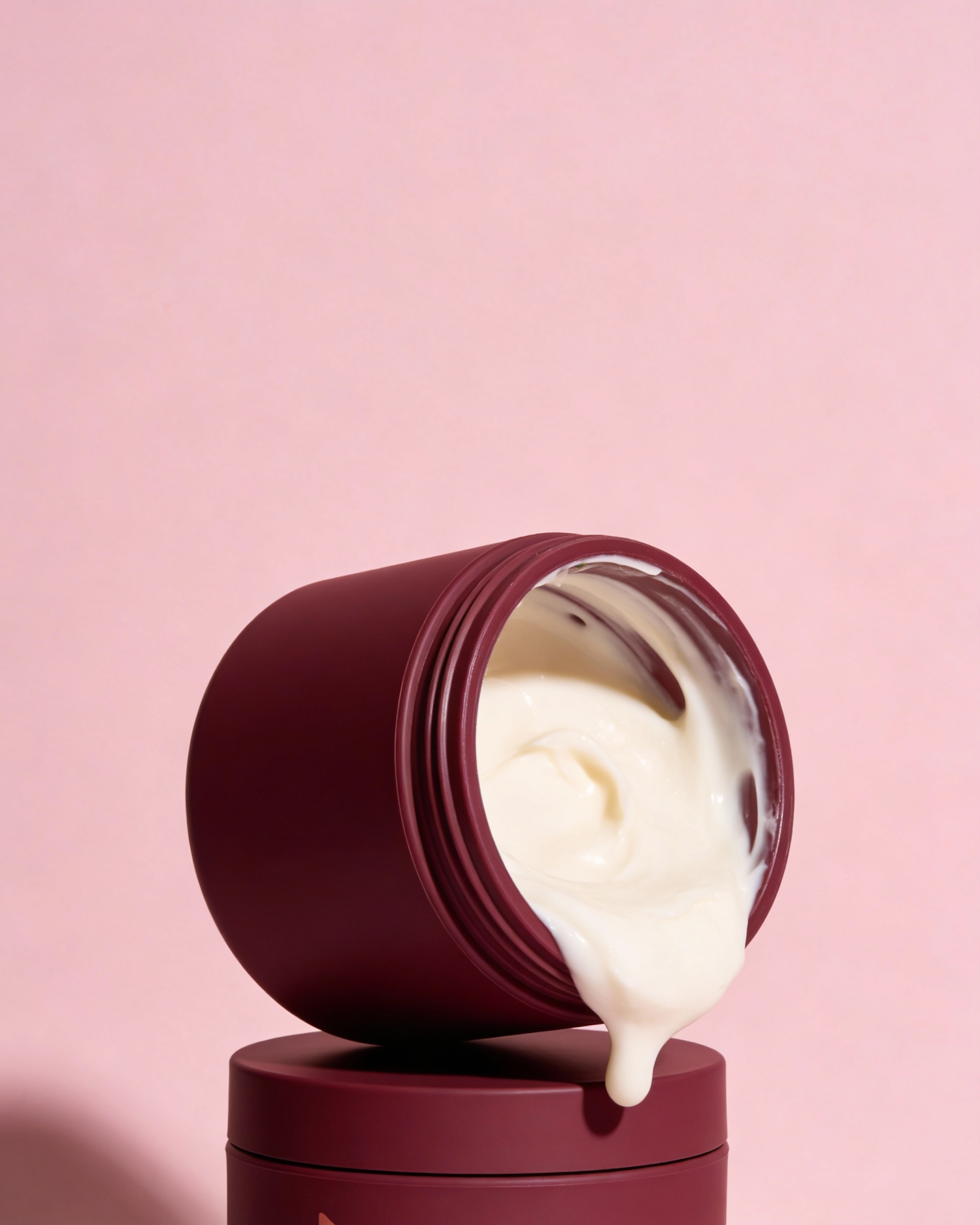 A burgundy container with cream spilling out, set against a pastel pink background, showcasing a clean and minimalistic aesthetic.