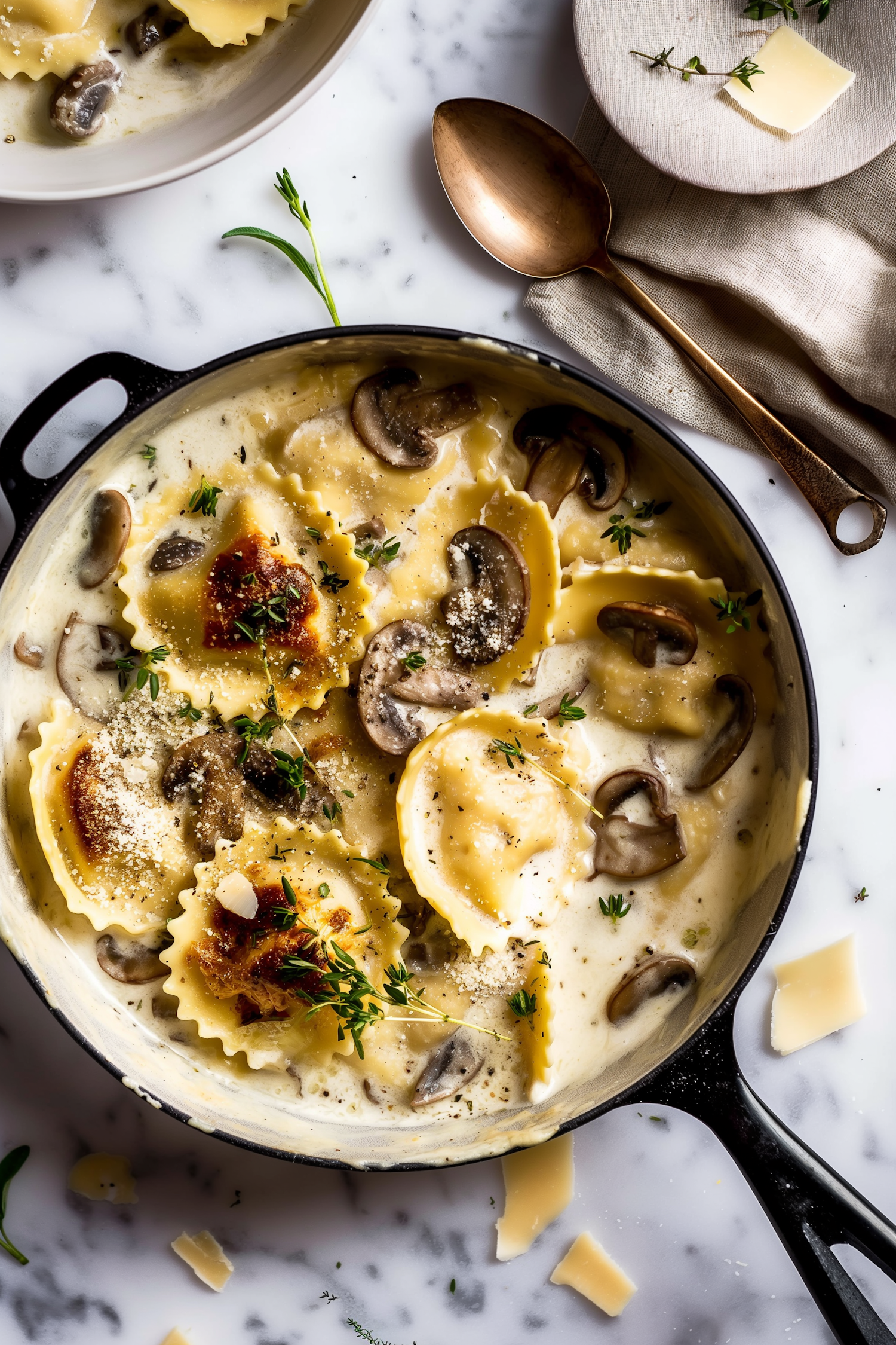 Creamy mushroom ravioli in a skillet with thyme and Parmesan on a marble surface, accompanied by a bronze spoon.