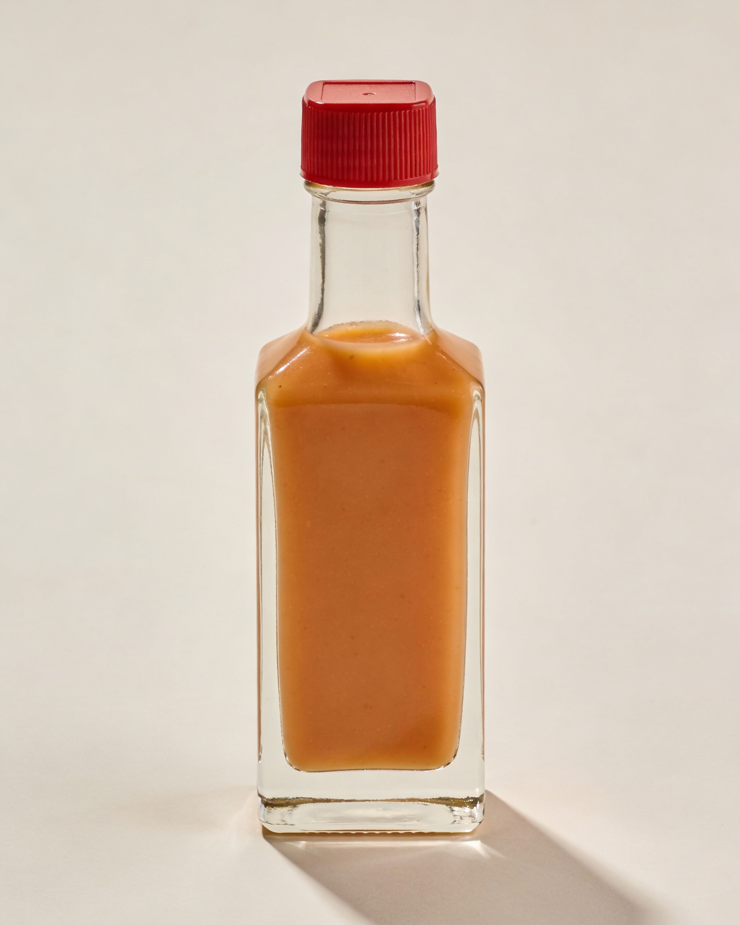 Ultra-realistic product photography of a hot sauce bottle, clean studio setup, neutral background, soft diffused studio lighting, subtle natural shadow under the bottle, sharp focus, realistic glass reflections, minimal composition, transparent clear glass bottle, rectangular shape with straight vertical sides, slightly rounded corners, flat front and flat back, thick glass base, short straight neck without shoulders, square footprint, tall ribbed plastic screw cap, matte finish, flat top, no branding, no text, no label, high detail, professional food photography filled with a light orange to amber hot sauce, smooth and fluid texture, matte red screw cap, plain light neutral background