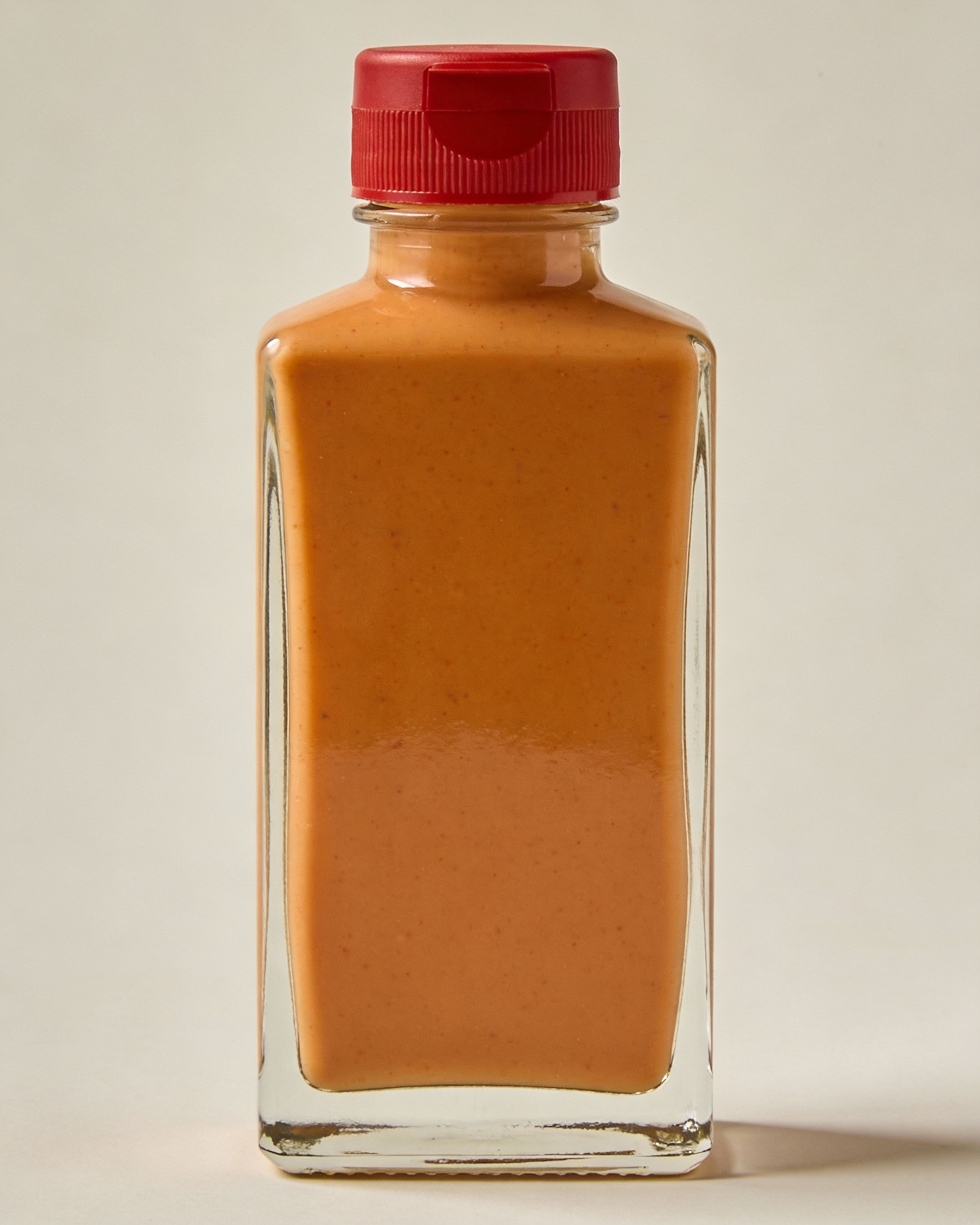 A clear glass bottle with a red cap, filled with creamy orange sauce, set against a neutral background.