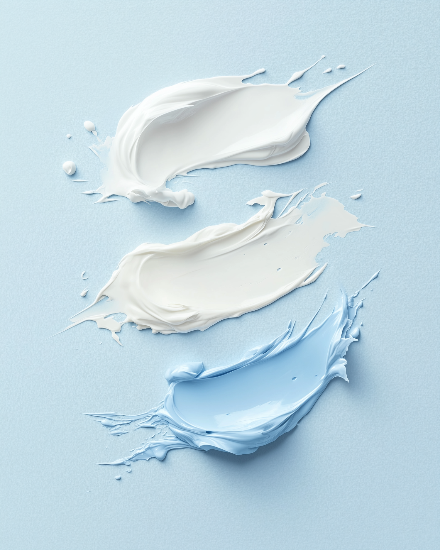 Artistic smears of white and blue cream on a light blue background, creating a soothing and harmonious visual effect.
