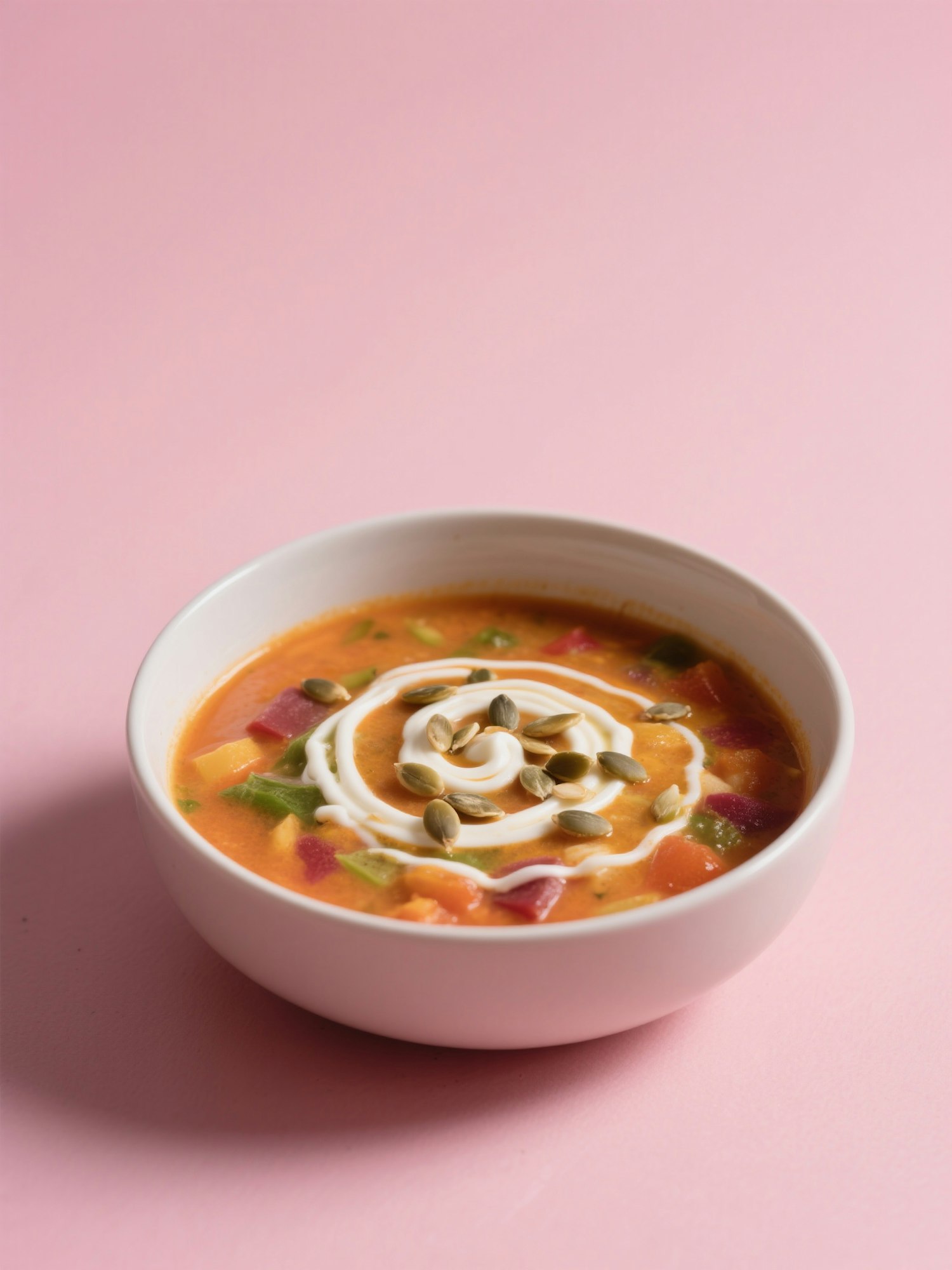A vibrant bowl of creamy vegetable soup with a swirl of cream and pumpkin seeds, served on a pastel pink background.