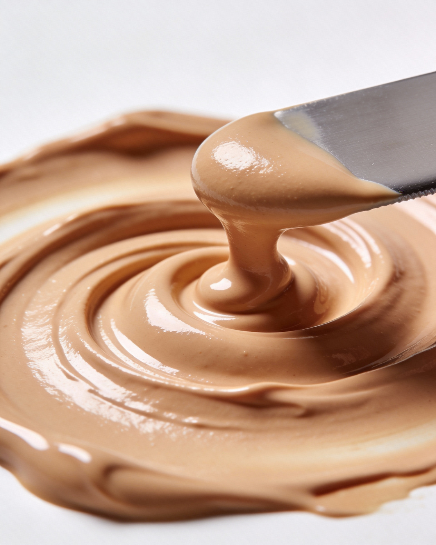 ultra realistic macro beauty product photography, extreme close-up texture focus, clean white background, soft diffused studio lighting, subtle natural shadows, high detail micro-texture, sharp focus on texture, shallow depth of field, premium cosmetic advertising shot, 85mm macro lens, f/5.6, high resolution,a swirl of liquid foundation spread in a circular motion using a cosmetic spatula, visible smooth ridges and spiral grooves, satin finish with soft highlights, warm beige tone, macro focus on the thickness and smooth creamy flow, minimal product-only composition