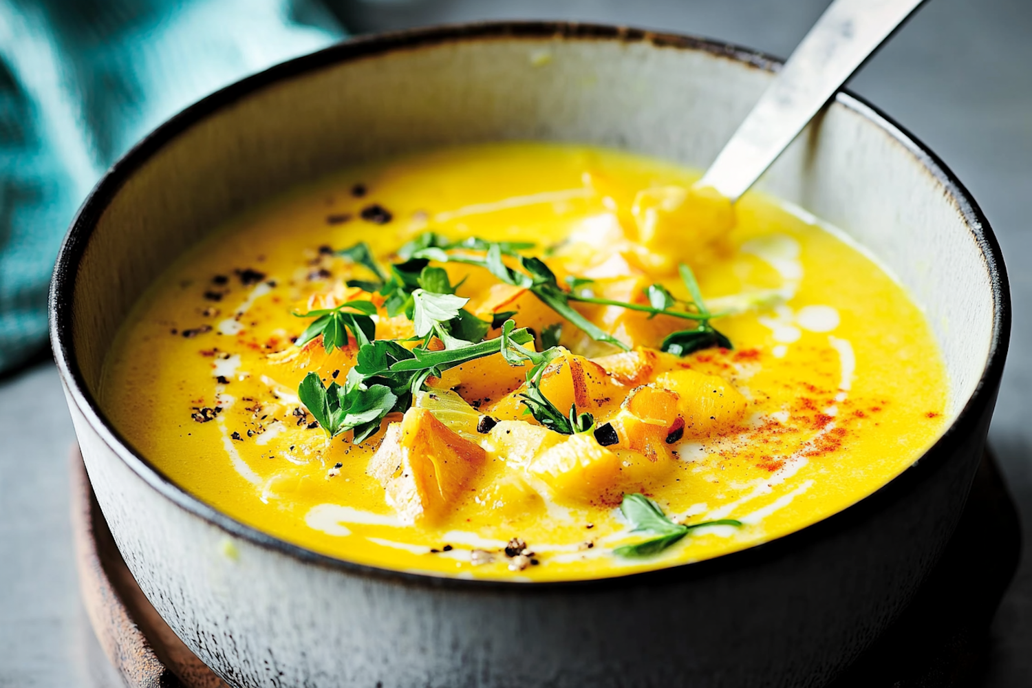 Creamy yellow soup with roasted vegetables, fresh herbs, and a drizzle of cream in a rustic bowl. Perfect for cozy, flavorful meals.