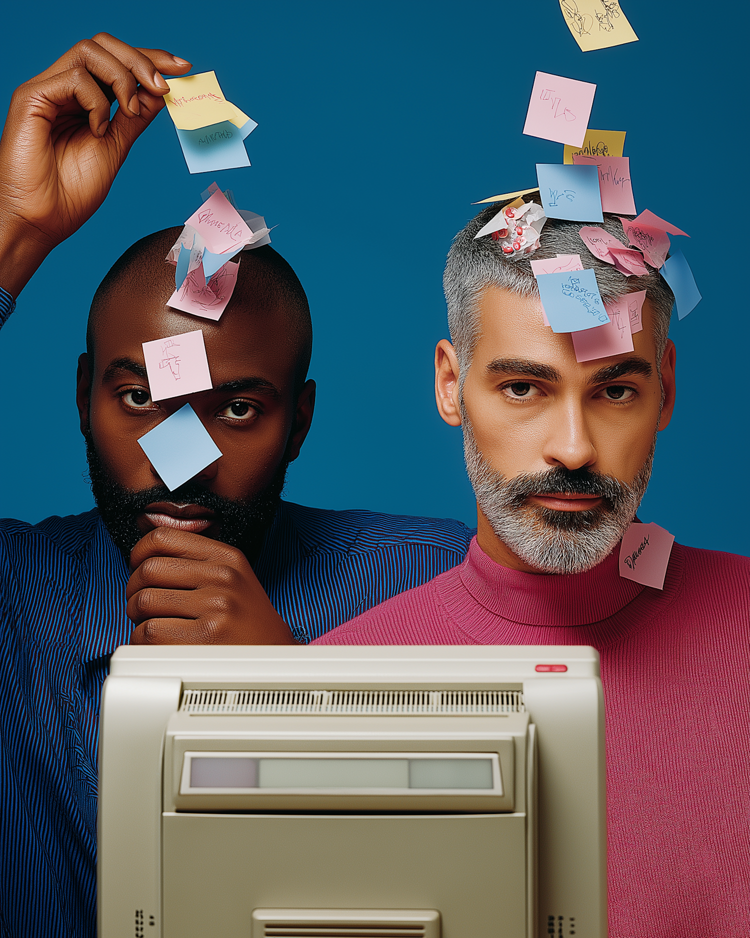 Two men with sticky notes on their heads behind a retro computer, set against a vibrant blue background. Creative and quirky vibe.