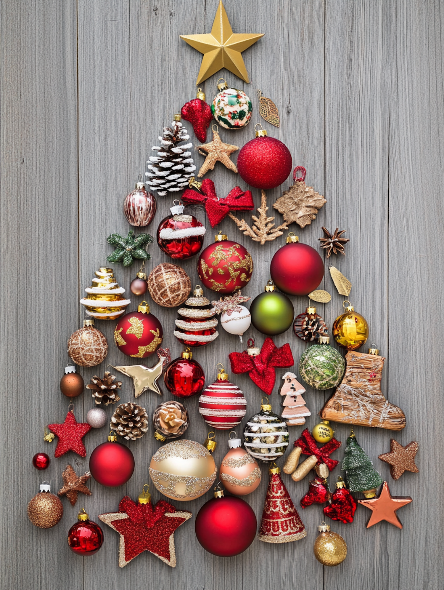 Festive Christmas tree shape made from colorful ornaments on a wooden background, featuring a golden star and vibrant baubles.