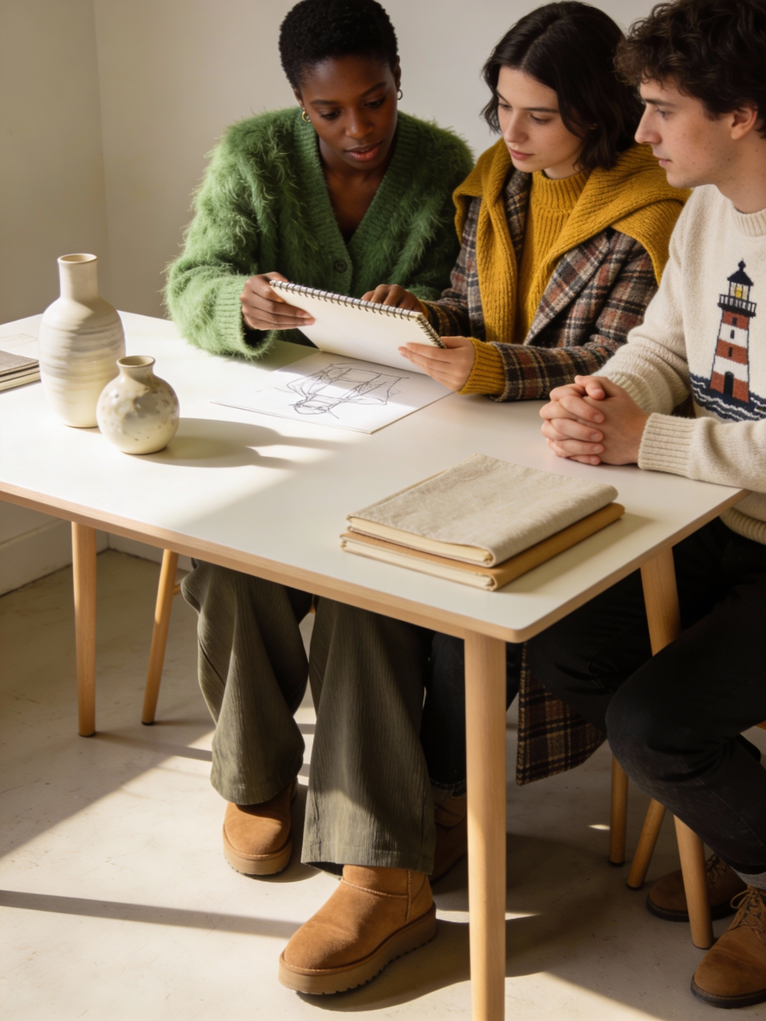 Black woman in a fuzzy green cardigan and wide-legged pants shares a sketchpad with a colleague in a plaid coat and mustard yellow sweater draped over the shoulders. Seated at a Scandinavian desk with ceramic decor and linen-bound notebooks, the group leans in, exchanging ideas. The lighthouse sweater wearer listens intently, hands folded. The lighting is warm and directional, highlighting knit textures, suede shoes, and the clean lines of the workspace