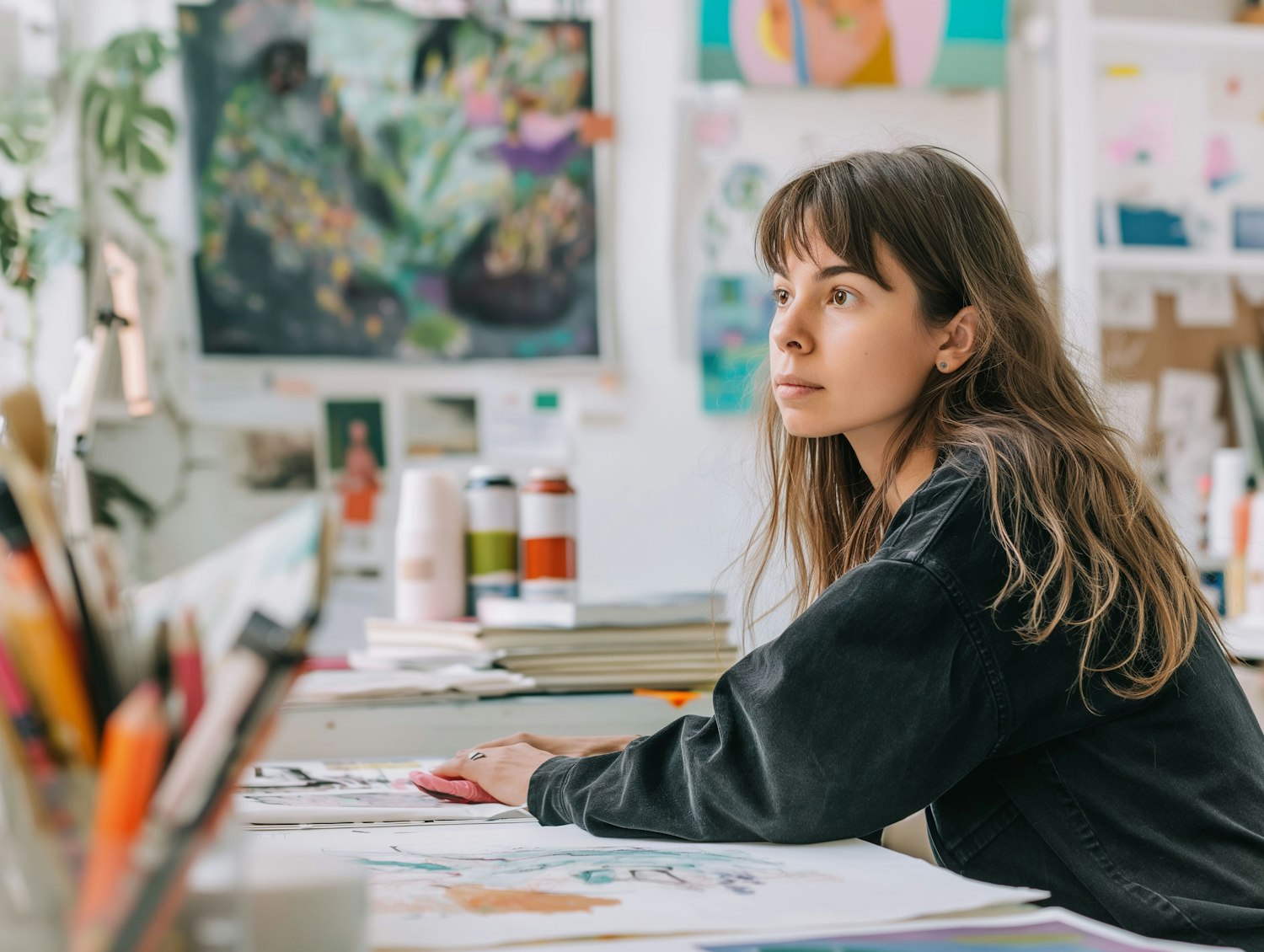 Young woman artist in a creative studio, surrounded by art supplies and colorful paintings, focused on her work.