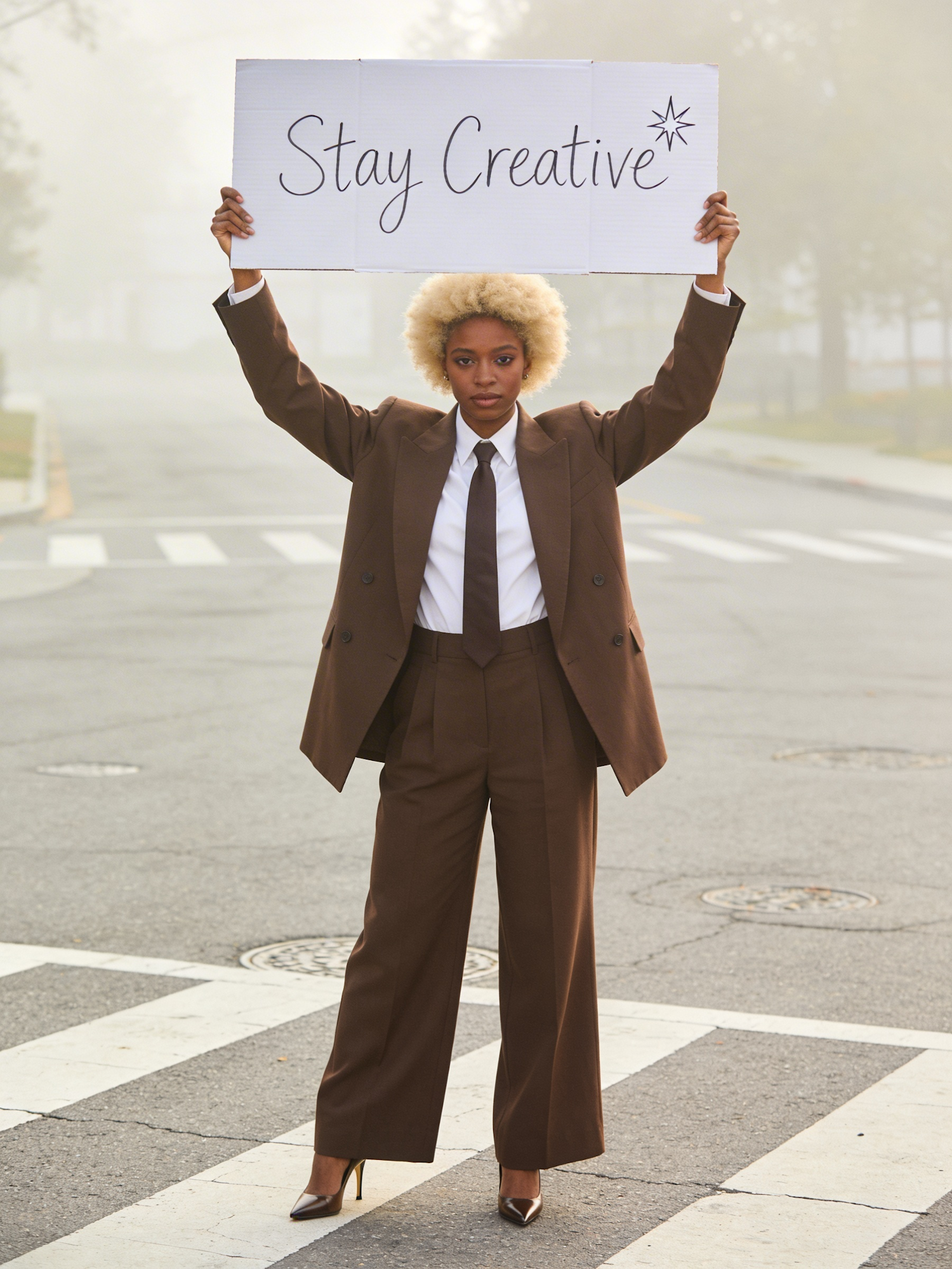 A person in a brown suit holds a 'Stay Creative' sign on a foggy street, blending style and inspiration in a serene urban setting.