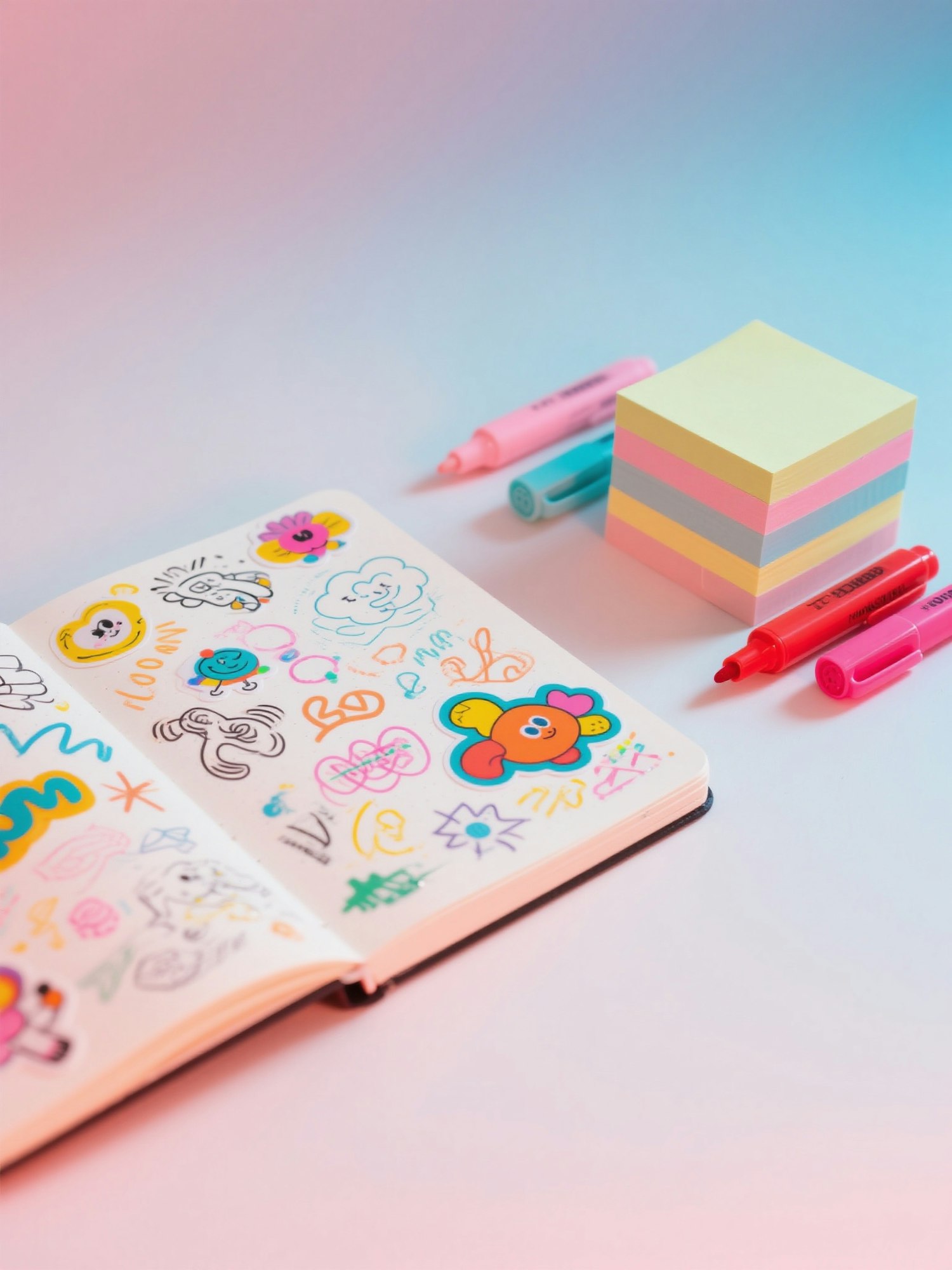 Colorful doodles in a notebook with pastel sticky notes and highlighters on a gradient background, perfect for creative inspiration.