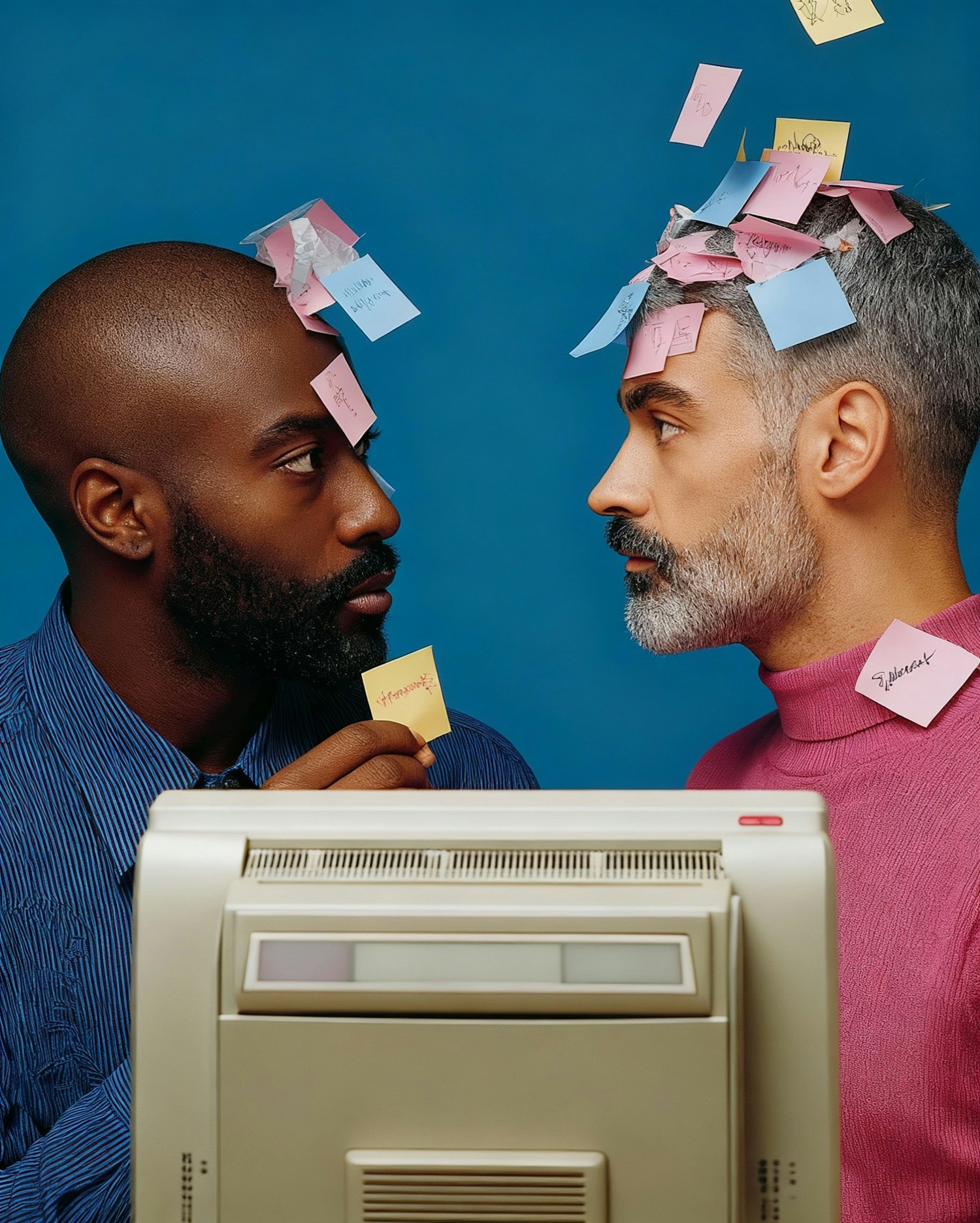 Two individuals with sticky notes on their heads and a retro computer in front, set against a blue background, creating a quirky office vibe.