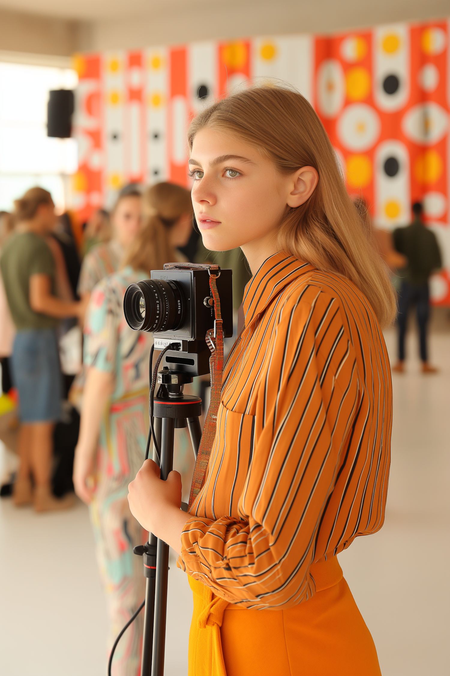 Young woman in orange outfit with camera at art gallery, focused expression, colorful abstract background.