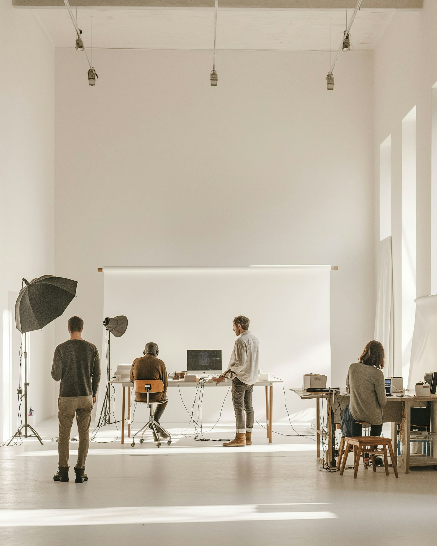 Bright, minimalistic studio with three people working at desks, surrounded by photography equipment and natural light.
