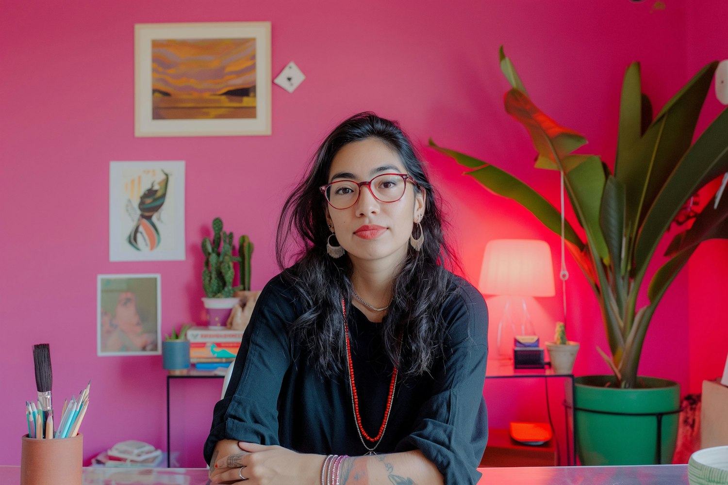 Woman with red glasses and black hair in a vibrant pink room with art and plants, exuding a creative and cozy vibe.