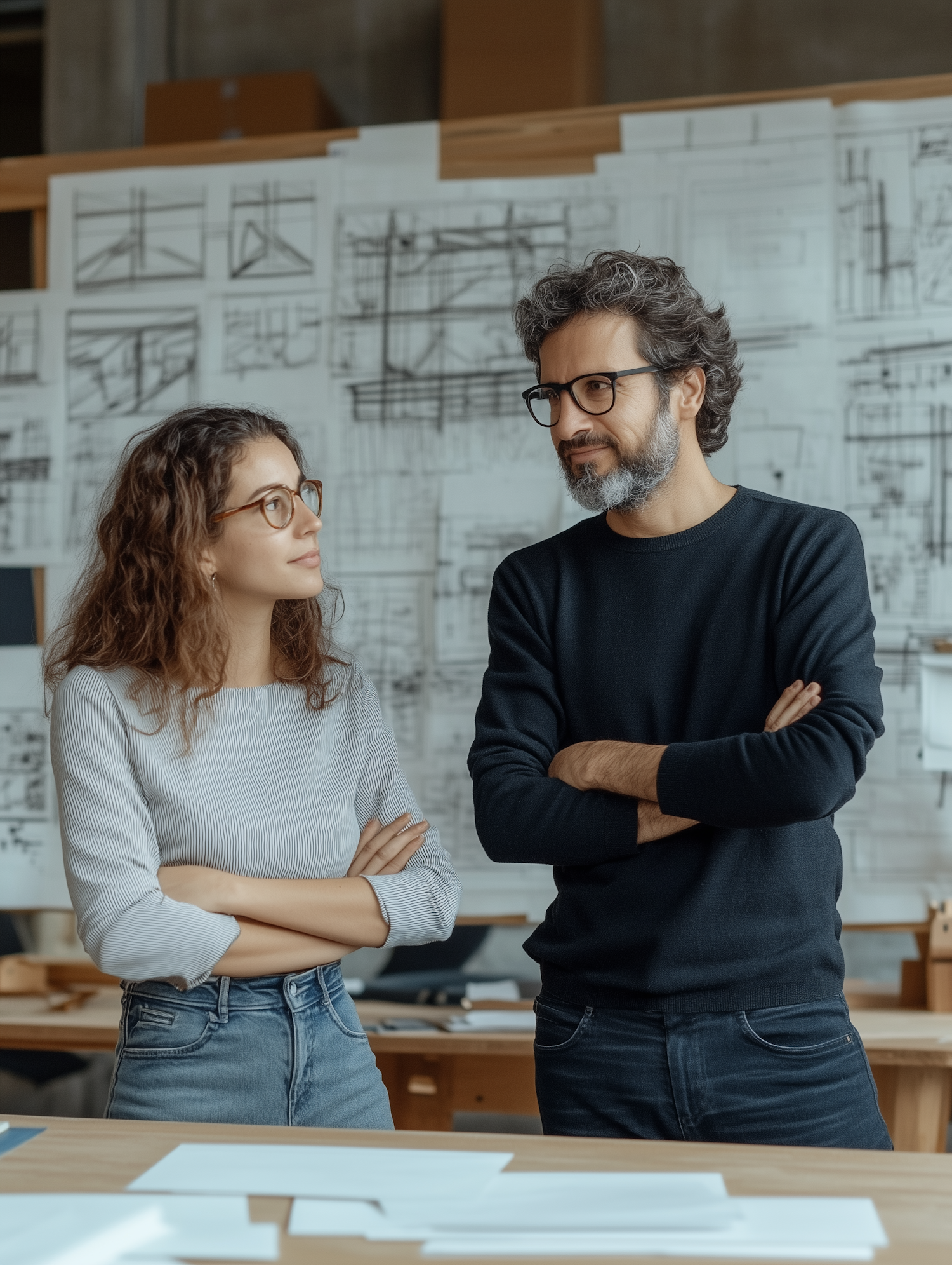 Two colleagues in an office discuss work, surrounded by architectural blueprints. Engaged in conversation, they exude professionalism.