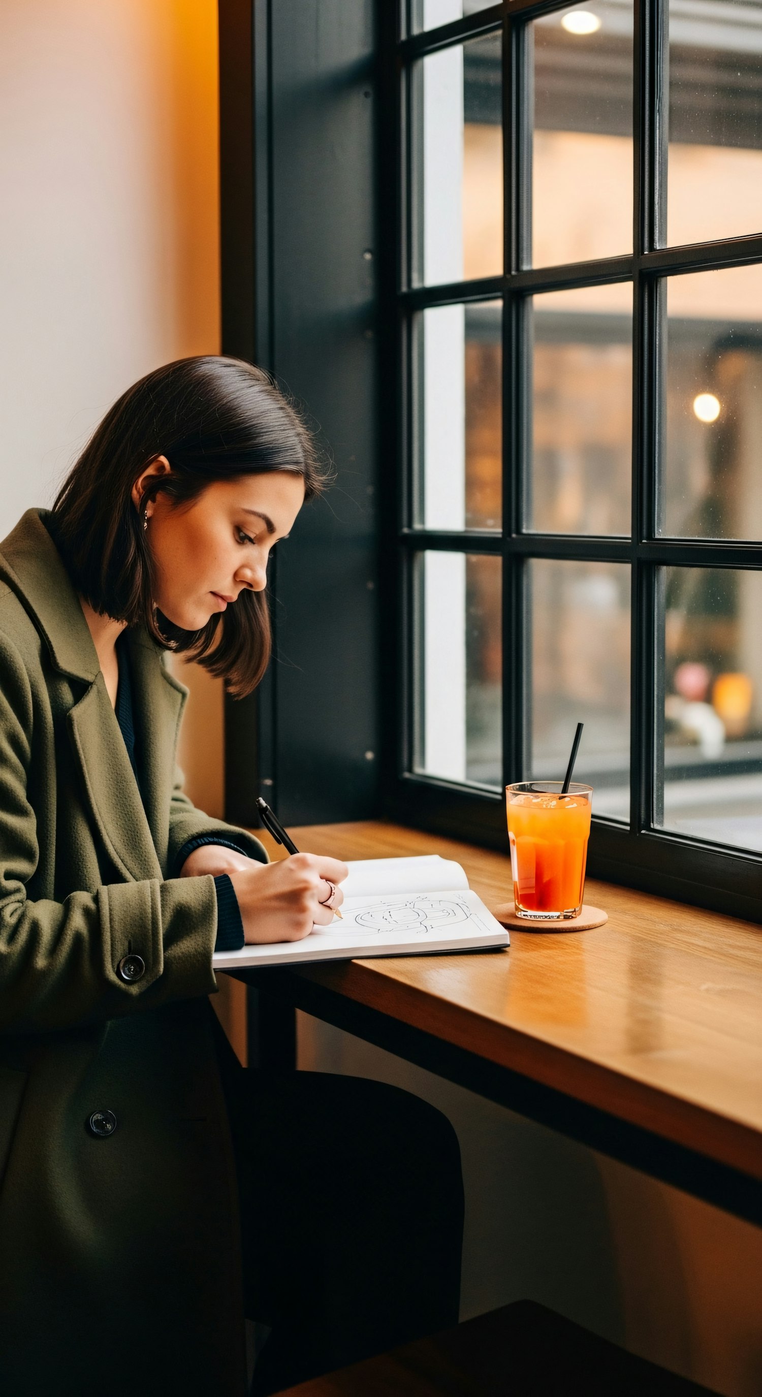 A woman sketching in a notebook by a window, with a glass of orange juice nearby, in a cozy and warmly lit setting.