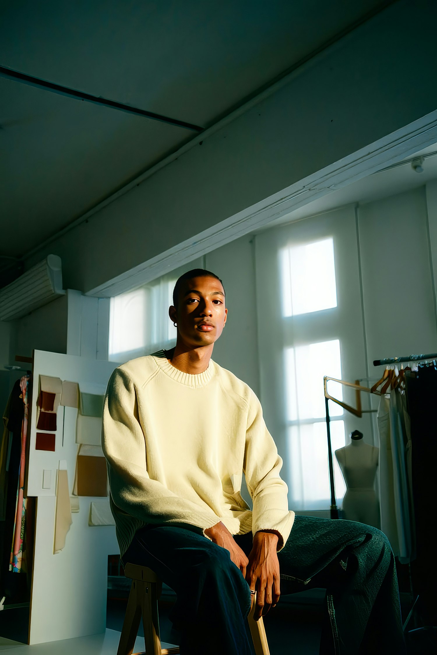 A young man in a light yellow sweater sits in a sunlit studio with fabric swatches and a mannequin in the background.