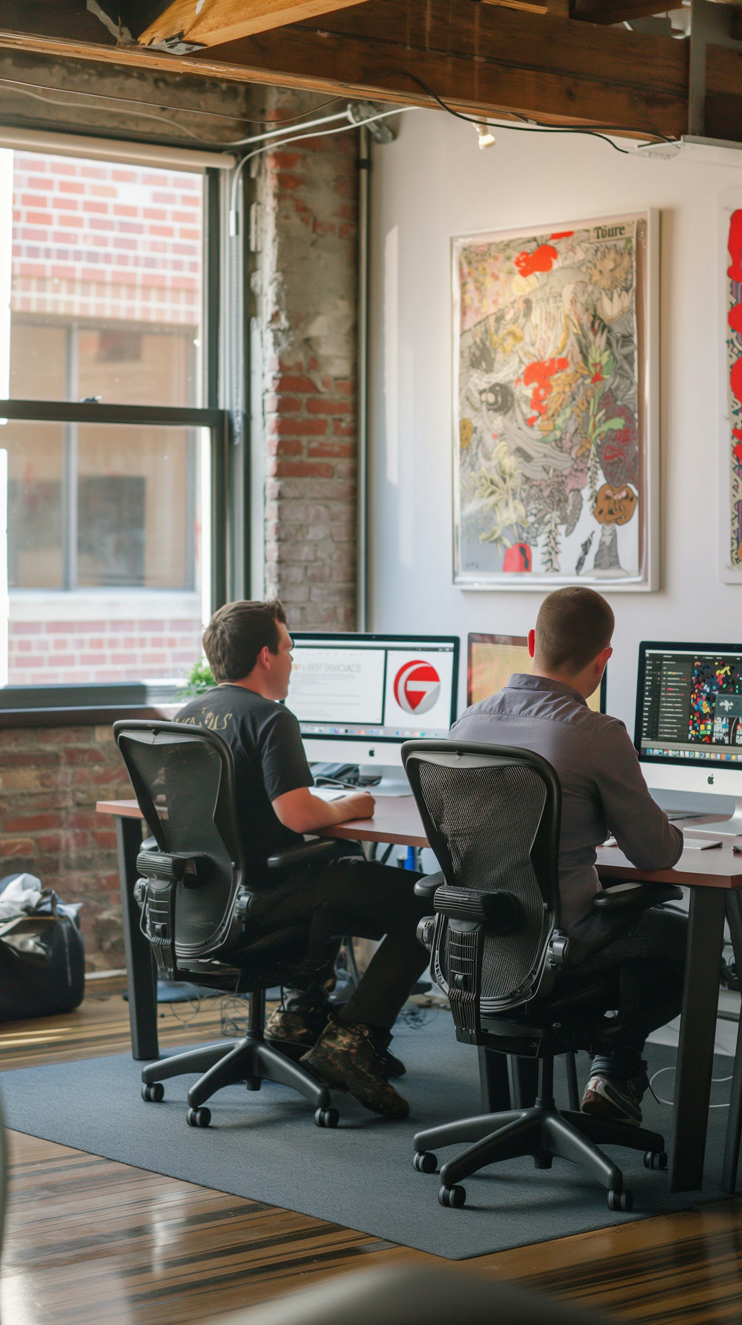 Two men working at computers in a modern office with exposed brick and colorful artwork, creating a focused and creative atmosphere.