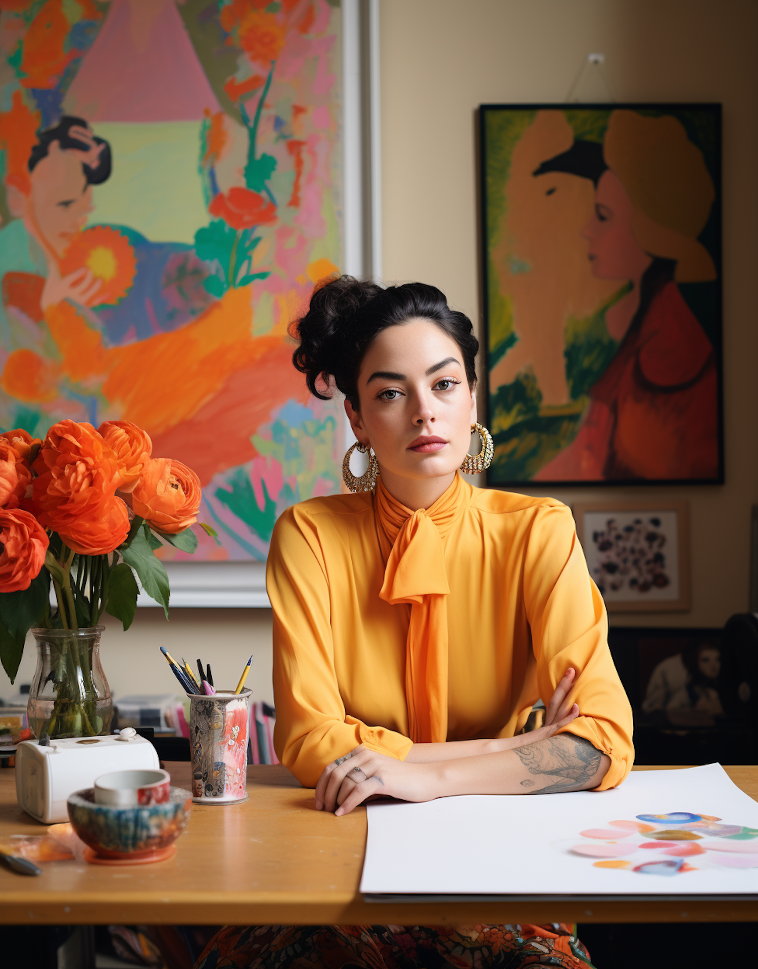 Woman in orange blouse with art supplies and abstract paintings, exuding creativity and elegance in a vibrant studio setting.