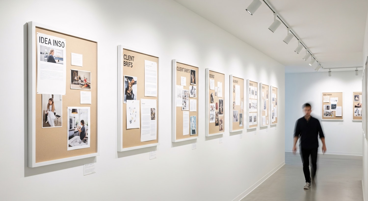 A modern hallway with bulletin boards showcasing creative projects and a person walking, creating a dynamic and professional atmosphere.