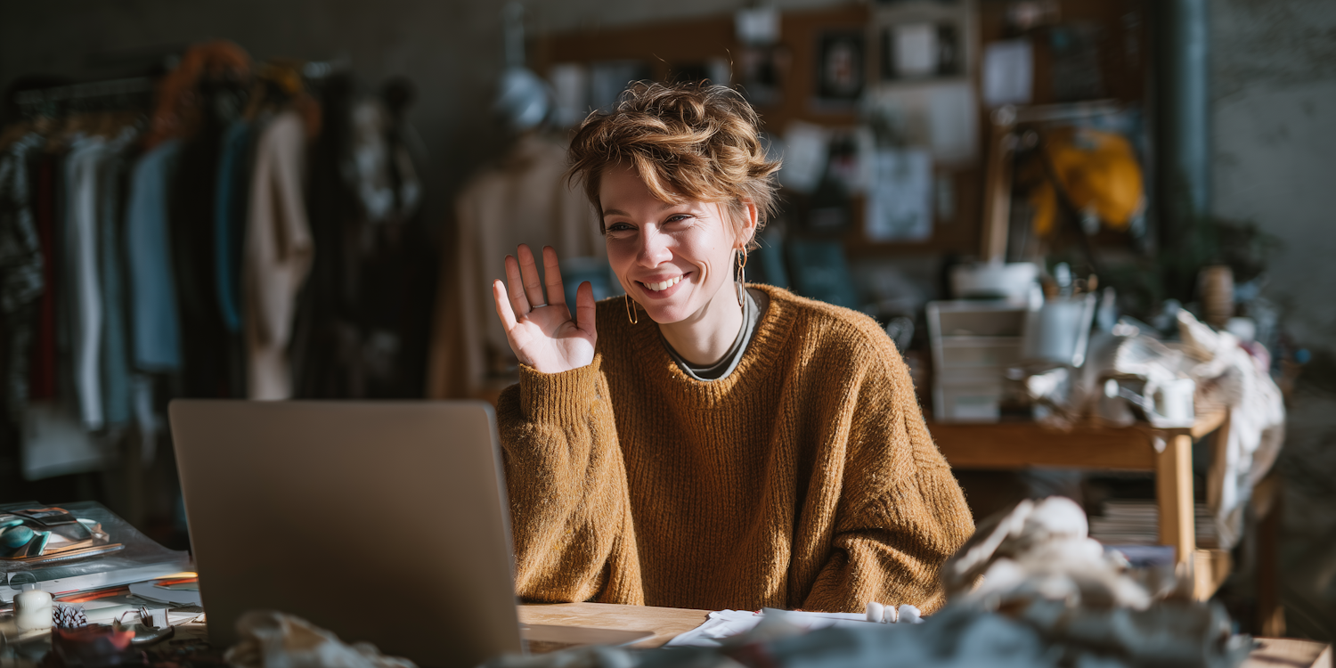 A cheerful woman in a cozy sweater waves at her laptop in a creative studio, surrounded by clothes and artistic supplies.