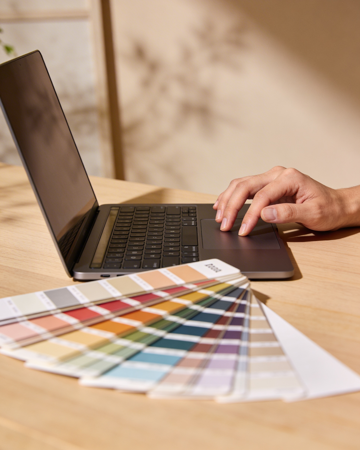 Ultra realistic lifestyle photography in a warm minimalist creative studio, soft natural light, editorial documentary photography style, warm neutral color palette, natural textures, shallow depth of field, photographed with a 50mm lens, subtle film grain, premium brand photography aesthetic, soft shadows, cozy modern interior, clean minimal background with beige wall, light wooden surfaces and warm tones, professional photographer composition Close up editorial shot of a hand using a laptop trackpad while printed color palettes rest beside the computer on a wooden surface. Warm beige minimal background, shallow depth of field, natural documentary photography feeling, clean premium aesthetic.