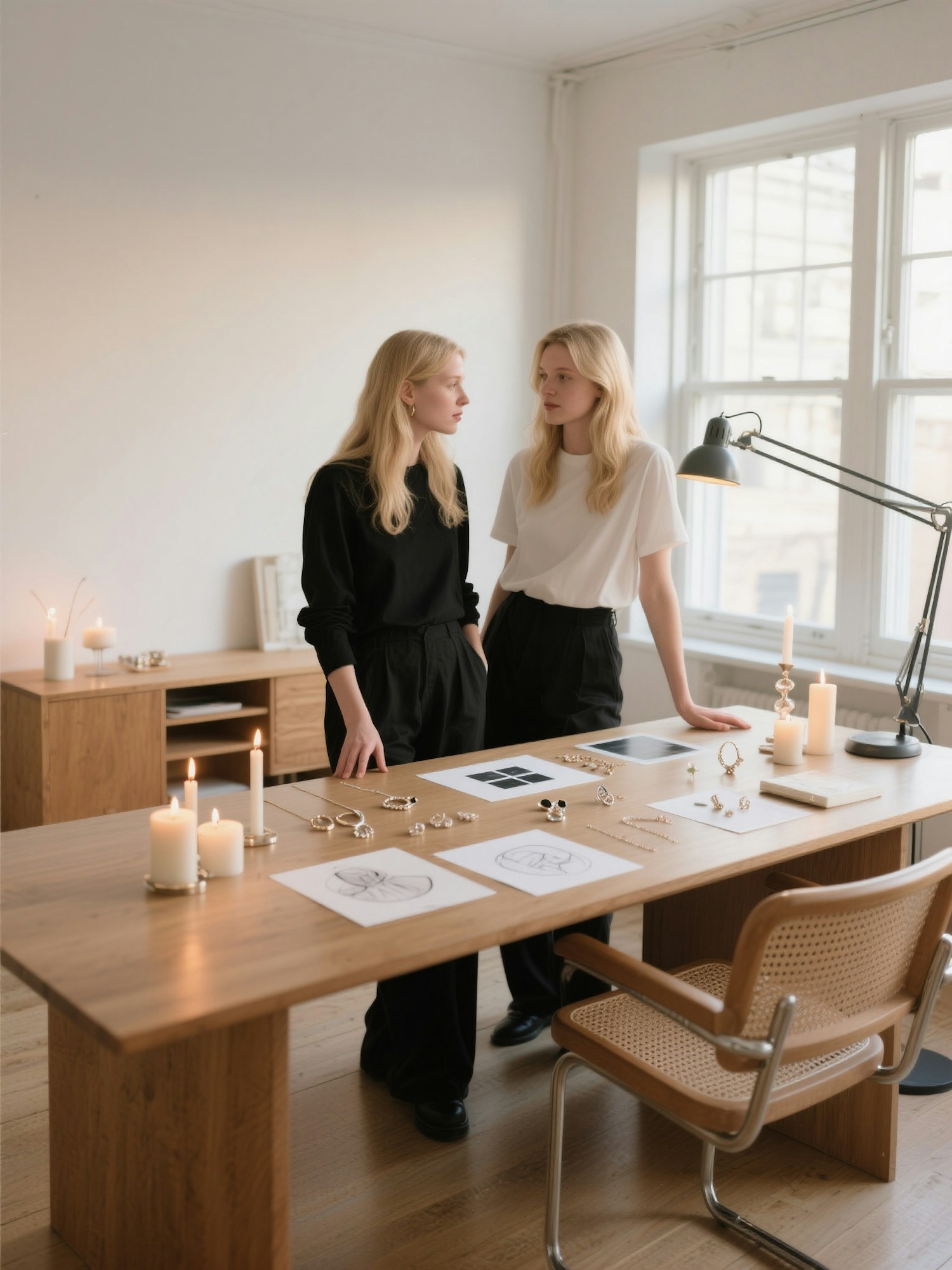 A minimal professional studio scene, natural window light, elegant styling, warm tones, wood furniture, candid atmosphere, documentary photography style, high-definition image, two women with fair skin and long blonde hair, dressed in casual black and white outfits, standing over a desk with candles, jewelry, and design mockups