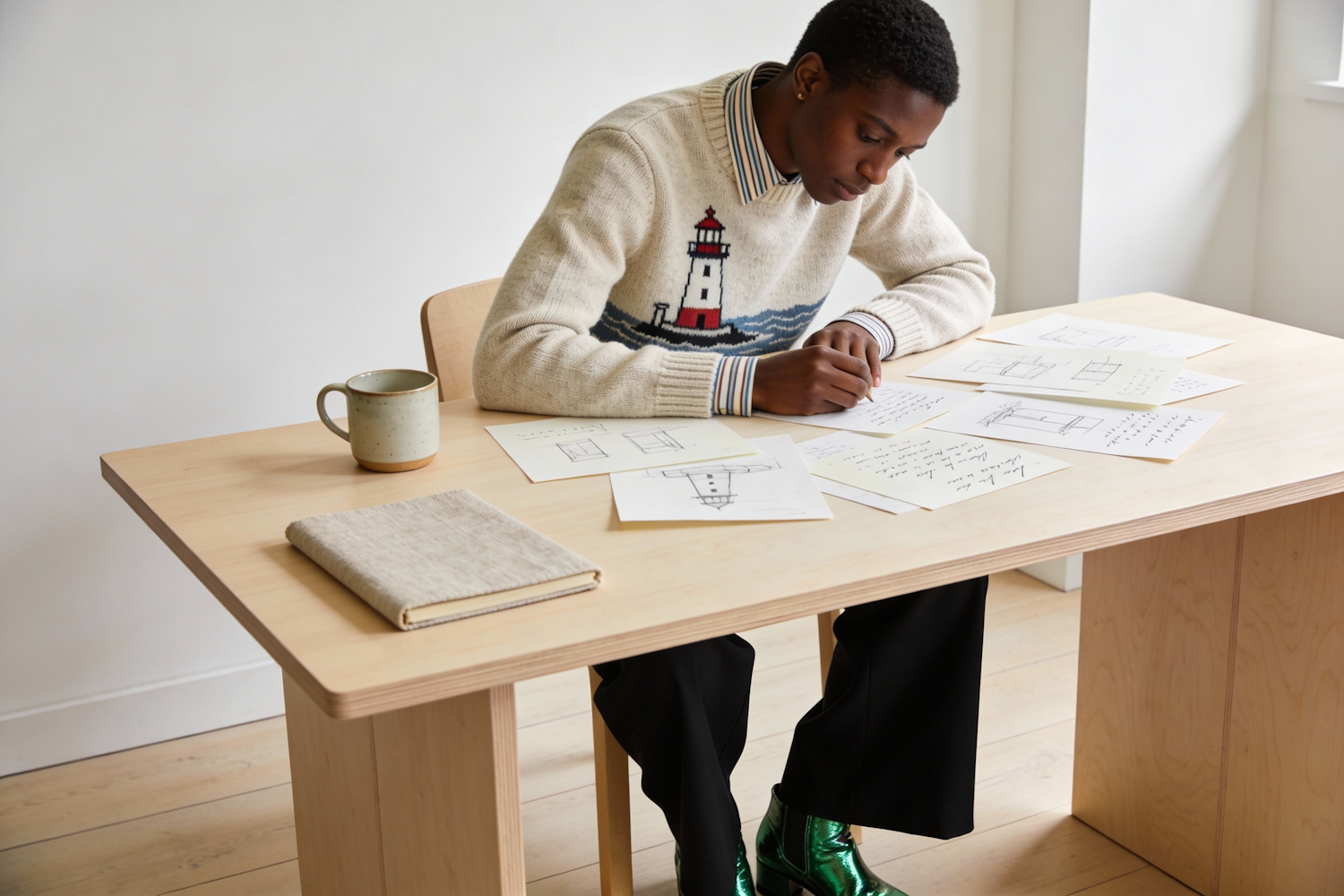 A person in a lighthouse sweater writes at a wooden table with sketches and notes, accompanied by a mug and book in a minimalist setting.