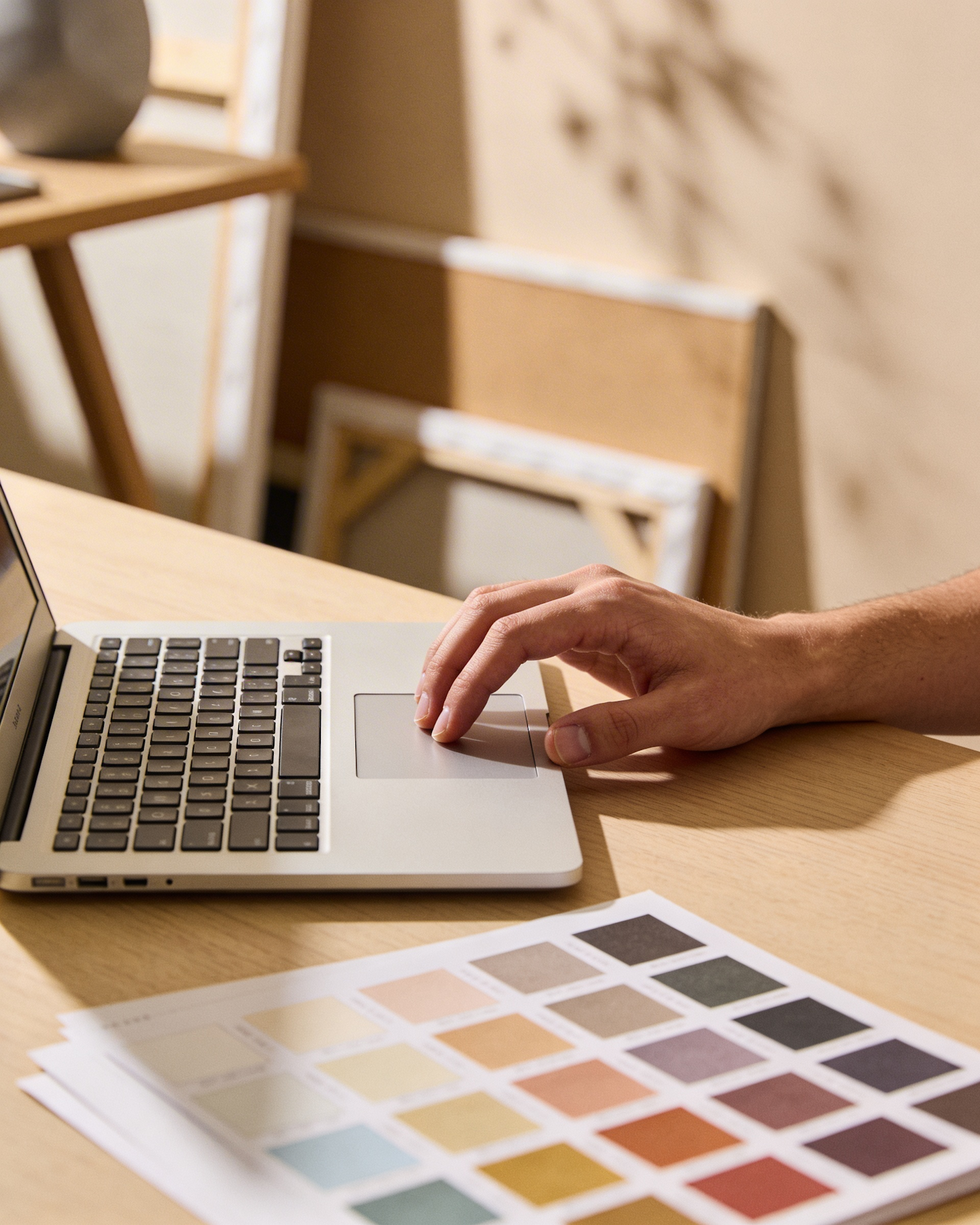 A hand using a laptop touchpad on a desk with a color swatch sheet, set in a warm, creative workspace environment.
