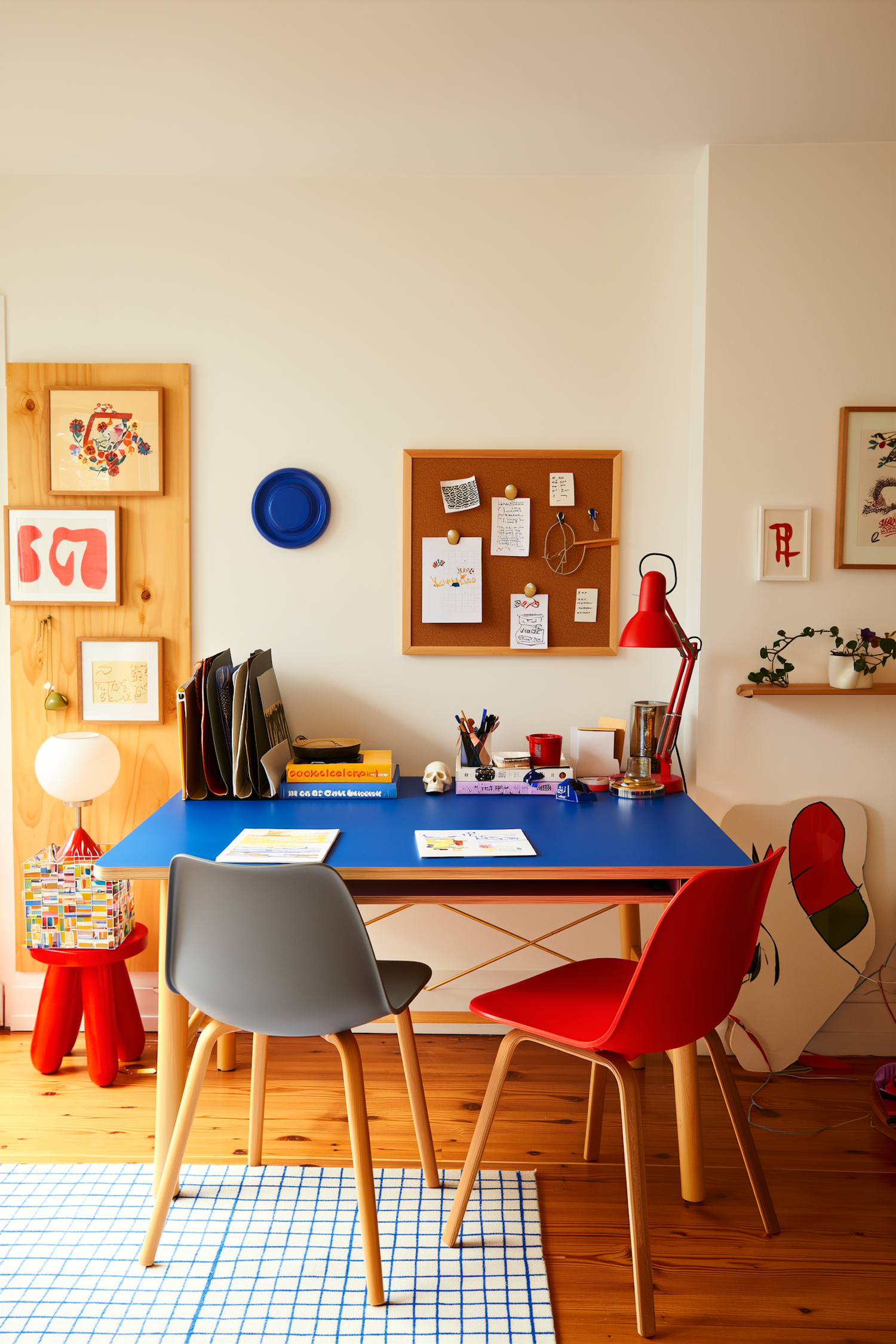 Bright and colorful workspace with a blue desk, red lamp, and creative decor, perfect for studying or working in a cheerful environment.