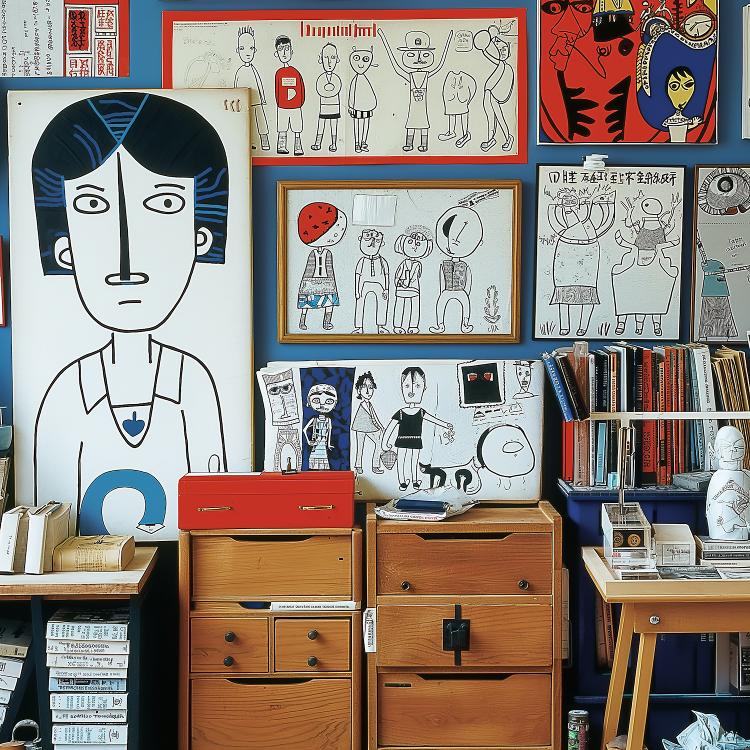 Art studio with vibrant illustrations and drawings, featuring bold colors and creative designs. Wooden cabinets and books add to the artistic vibe.