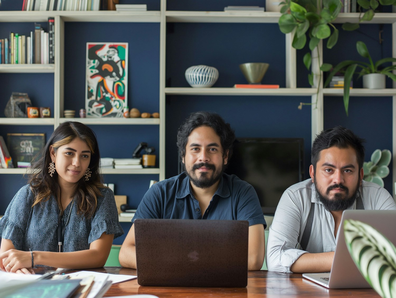 Three people working at a table with laptops, surrounded by books and plants, in a modern, creative workspace.
