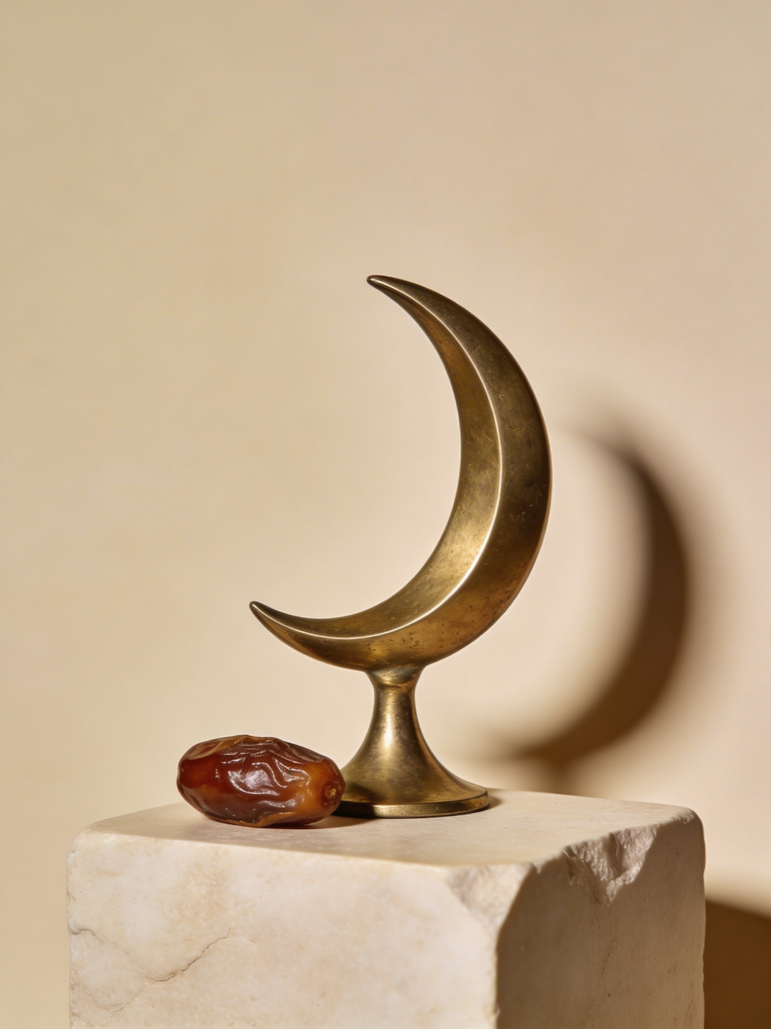 A high‑definition editorial still life for Ramadan. A brass crescent moon sculpture rests on a smooth stone plinth, paired with a single date placed deliberately beside it. Soft warm light creates long, elegant shadows against a neutral background. Minimal, serene, no text, no logos.