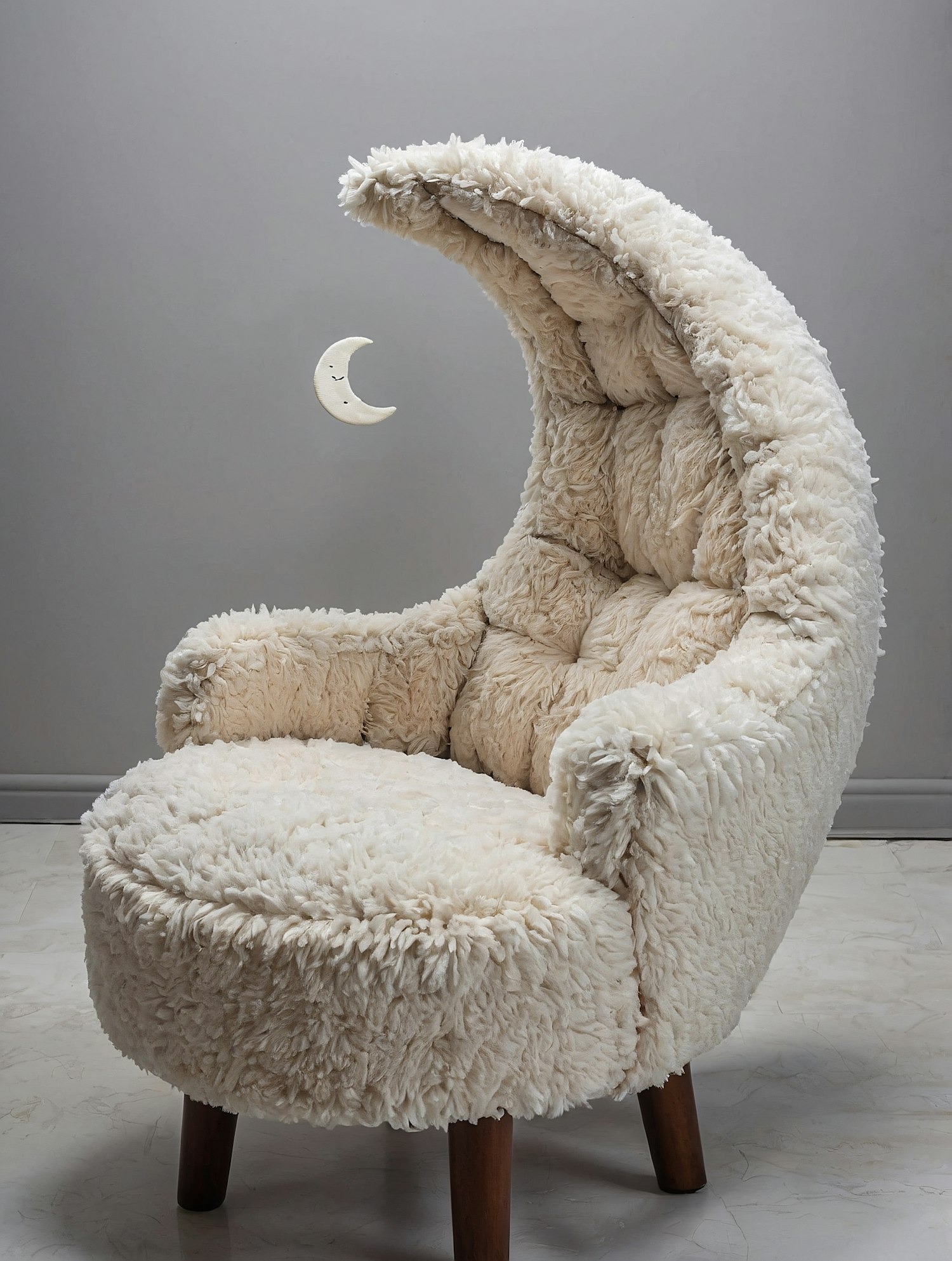 A fluffy crescent moon-shaped chair with wooden legs and a whimsical floating moon ornament in a minimalist setting.