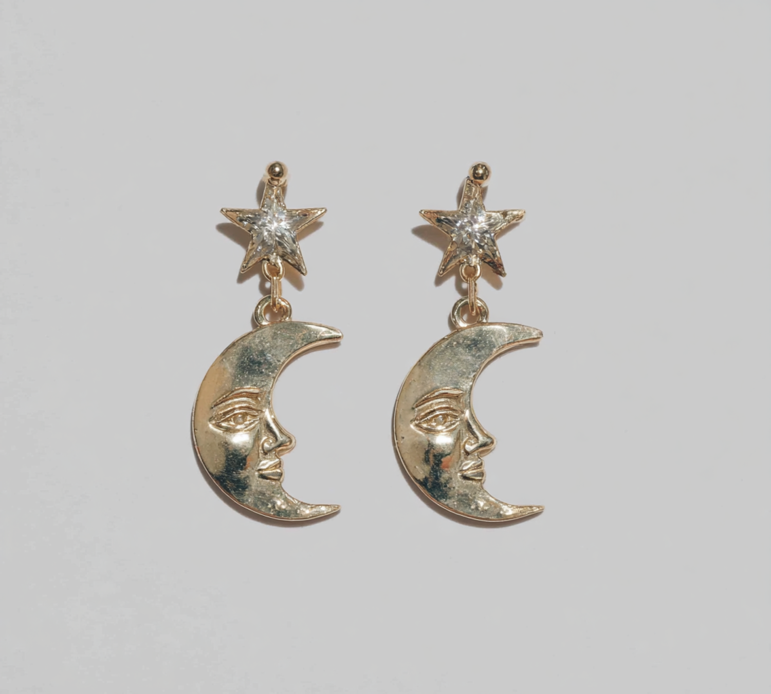 Elegant gold crescent moon earrings with star-shaped studs, perfect for adding a celestial touch to your outfit.