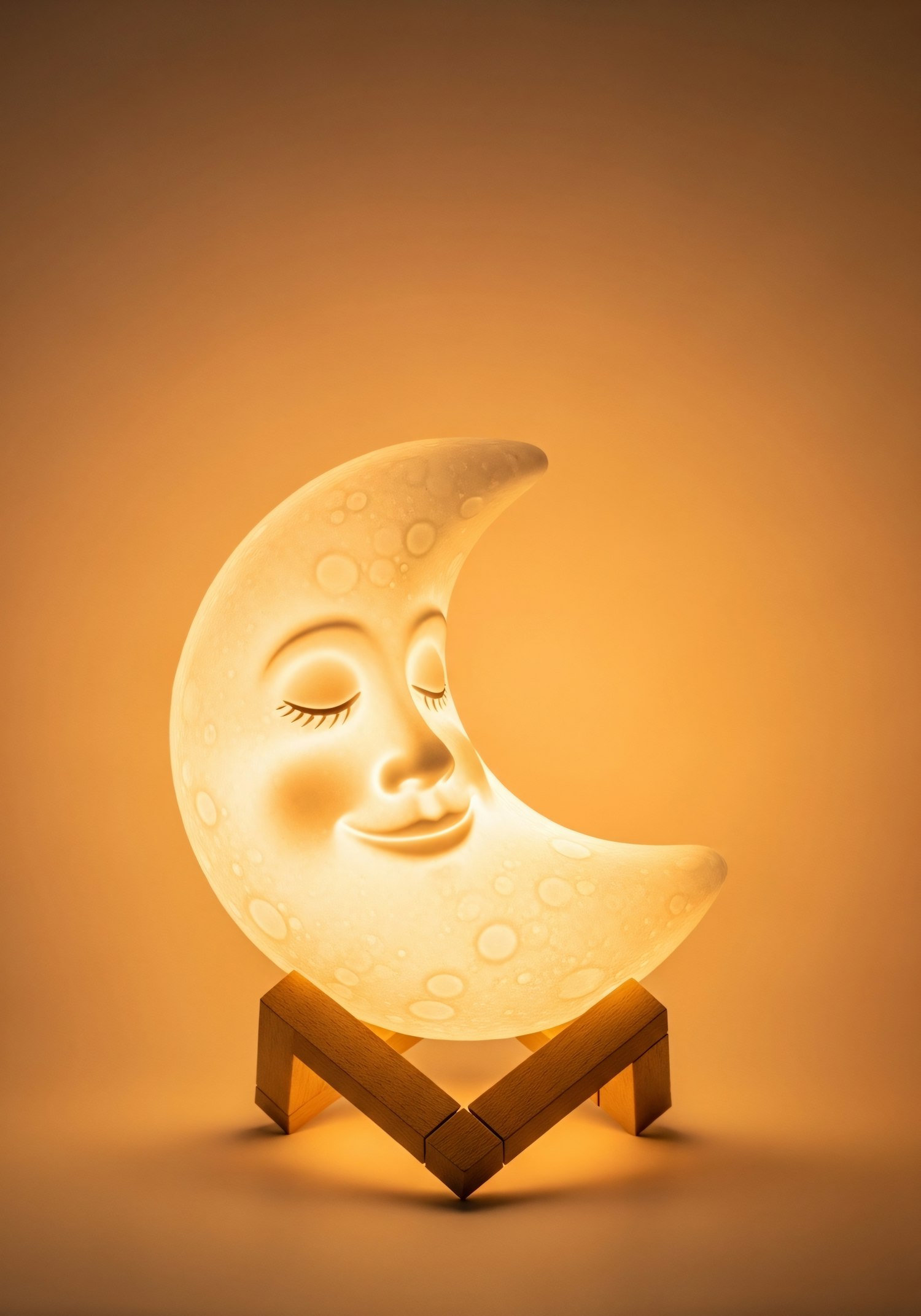 A crescent moon-shaped lamp with a serene face emits a warm glow, resting on a wooden stand against a soft gradient background.