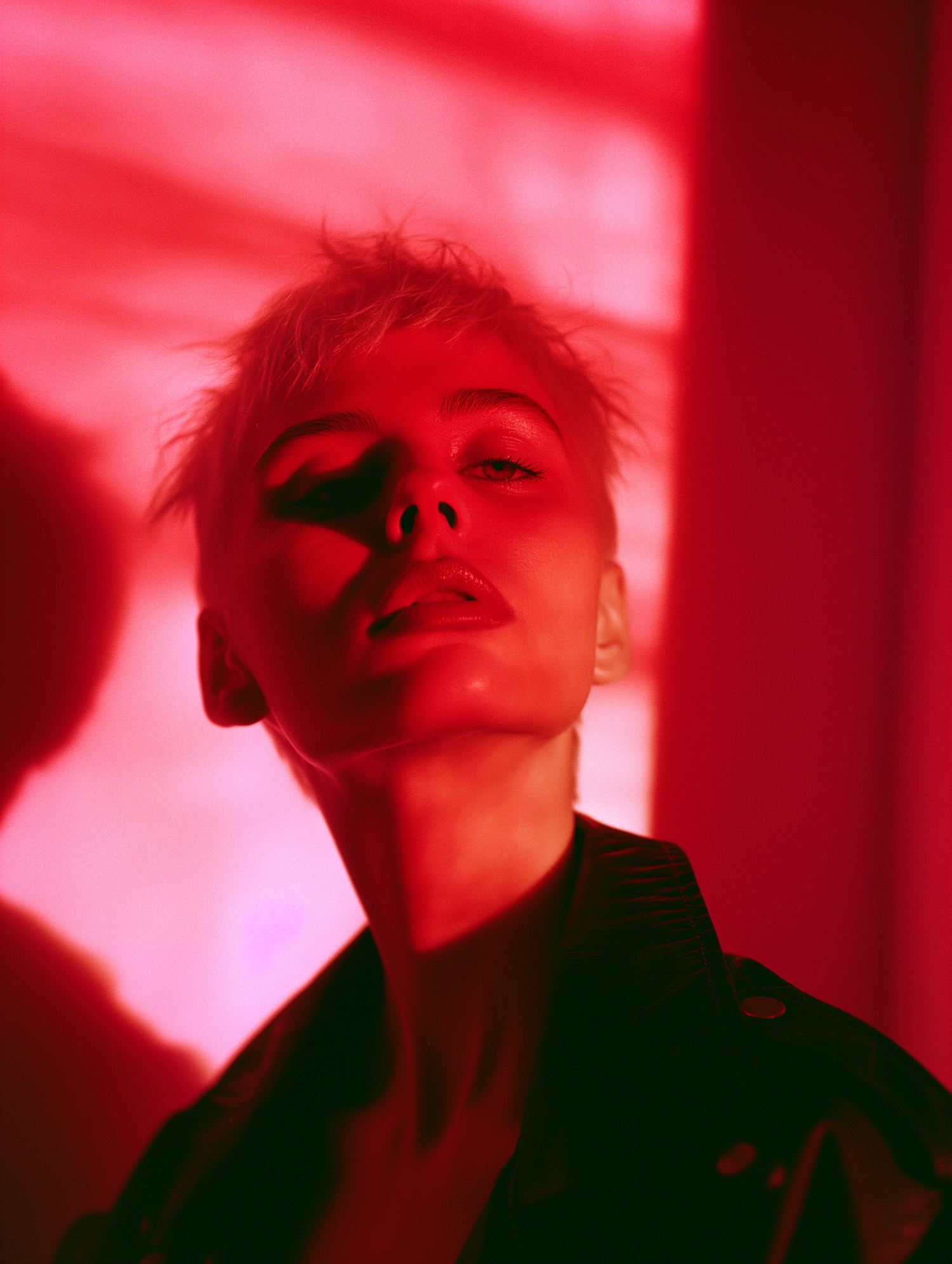Dramatic portrait with intense red lighting, featuring a person with short hair and a confident gaze, creating a bold and edgy atmosphere.