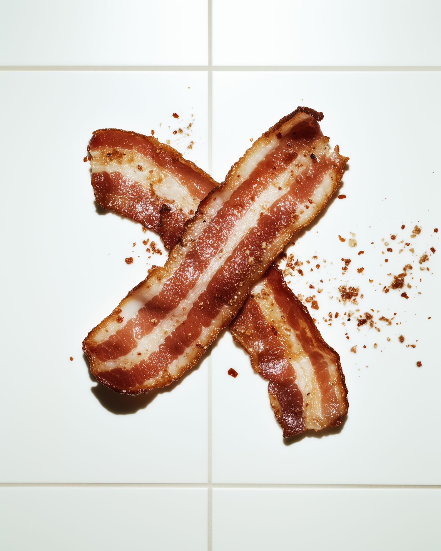 Two crispy bacon strips crossed on a white tiled surface, with scattered crumbs adding texture to the minimalist composition.