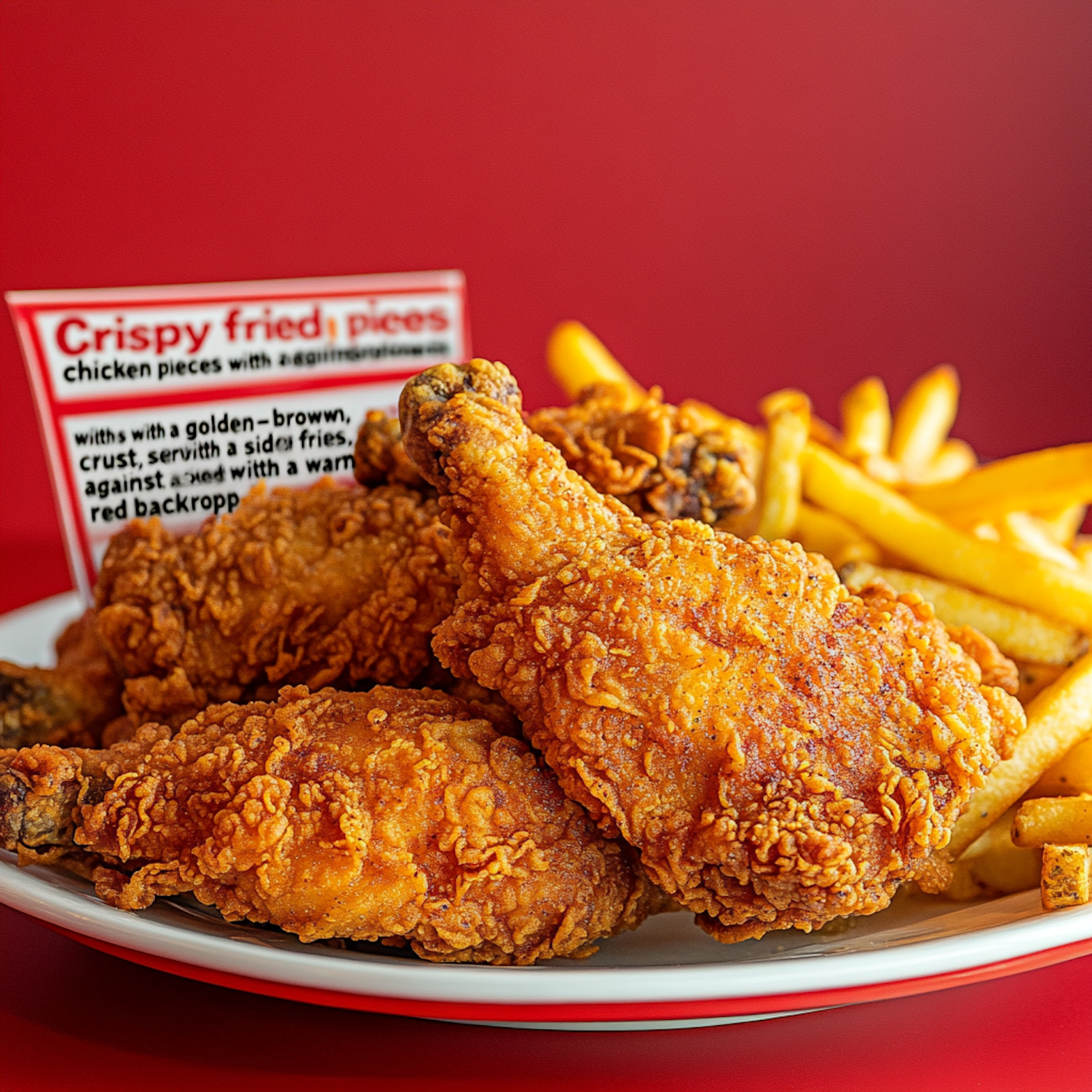 Golden crispy fried chicken and fries on a plate with a vibrant red background, highlighting the meal's rich textures and colors.