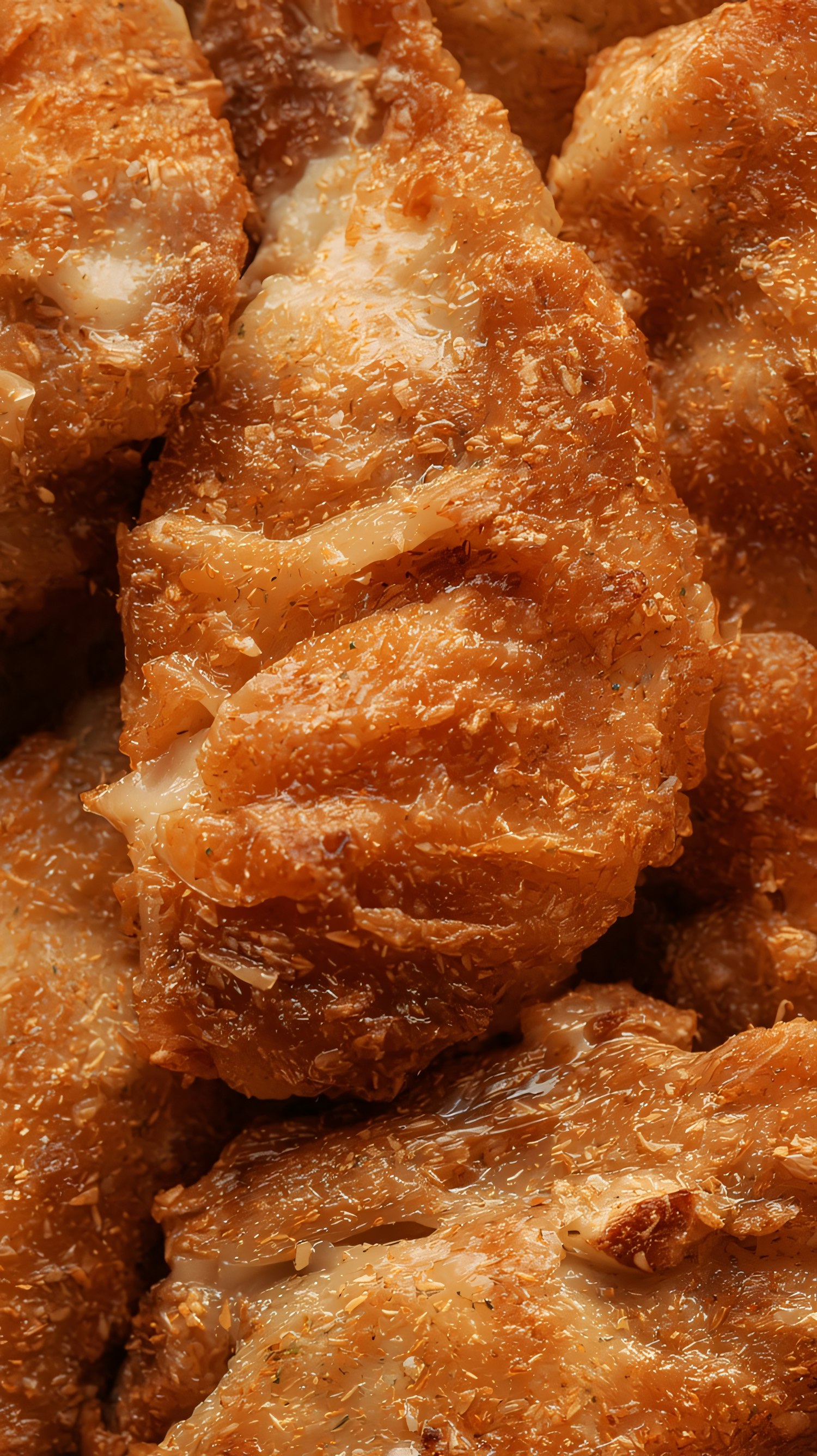 Close-up of crispy, golden-brown fried chicken pieces with a crunchy texture and glistening coating.