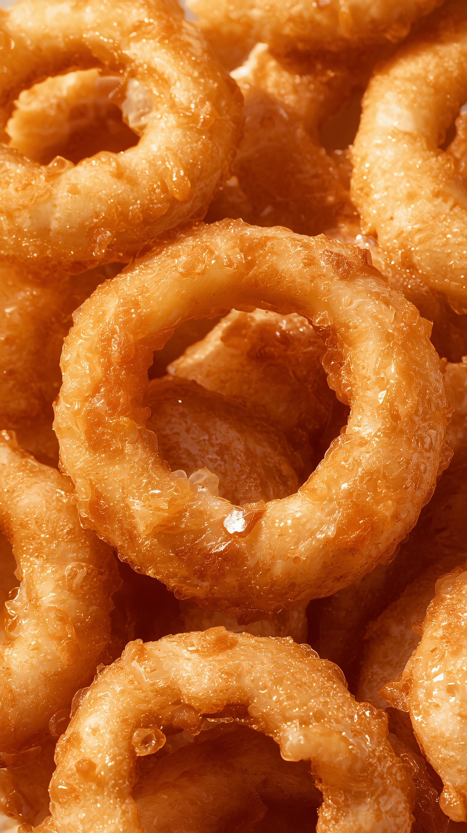 Close-up of crispy, golden-brown onion rings with a textured batter, showcasing their freshly fried and appetizing appearance.