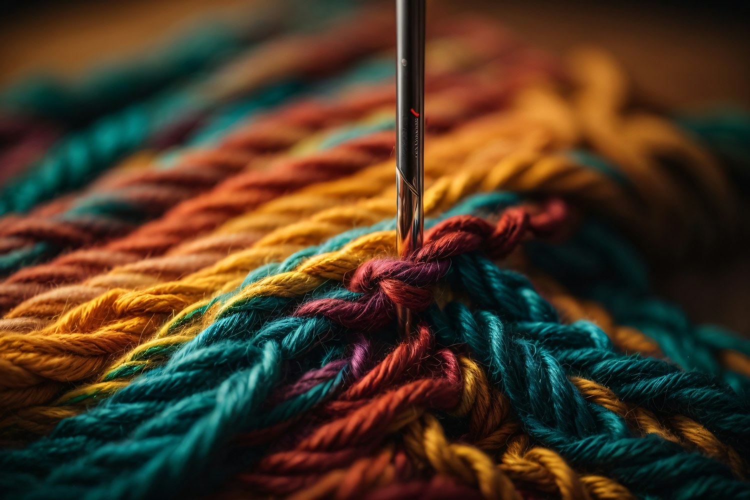 Vibrant close-up of a crochet hook with colorful yarn strands in teal, orange, yellow, and burgundy, highlighting texture and detail.