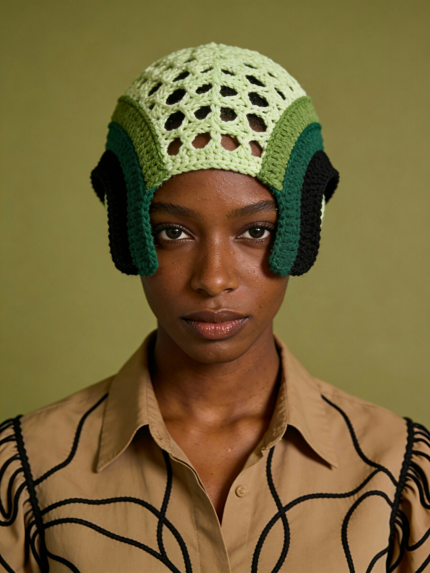 Black woman with rich brown skin wears a sculptural, handcrafted crocheted cap featuring openwork patterns and curved color sections in pale green, forest green, and black. Her gaze is calm and direct, framed by the soft geometry of the cap. She wears a taupe shirt with black piping that traces abstract, organic lines across the chest and sleeves, evoking a sense of quiet sophistication. The lighting is soft and diffused, enhancing the textures of yarn and fabric while casting gentle highlights on her skin. The background is a plain, complementary tone—muted sage green or warm clay beige—to harmonize with both her skin and the outfit’s palette. The overall mood is introspective and artful, celebrating craftsmanship, texture, and contemp