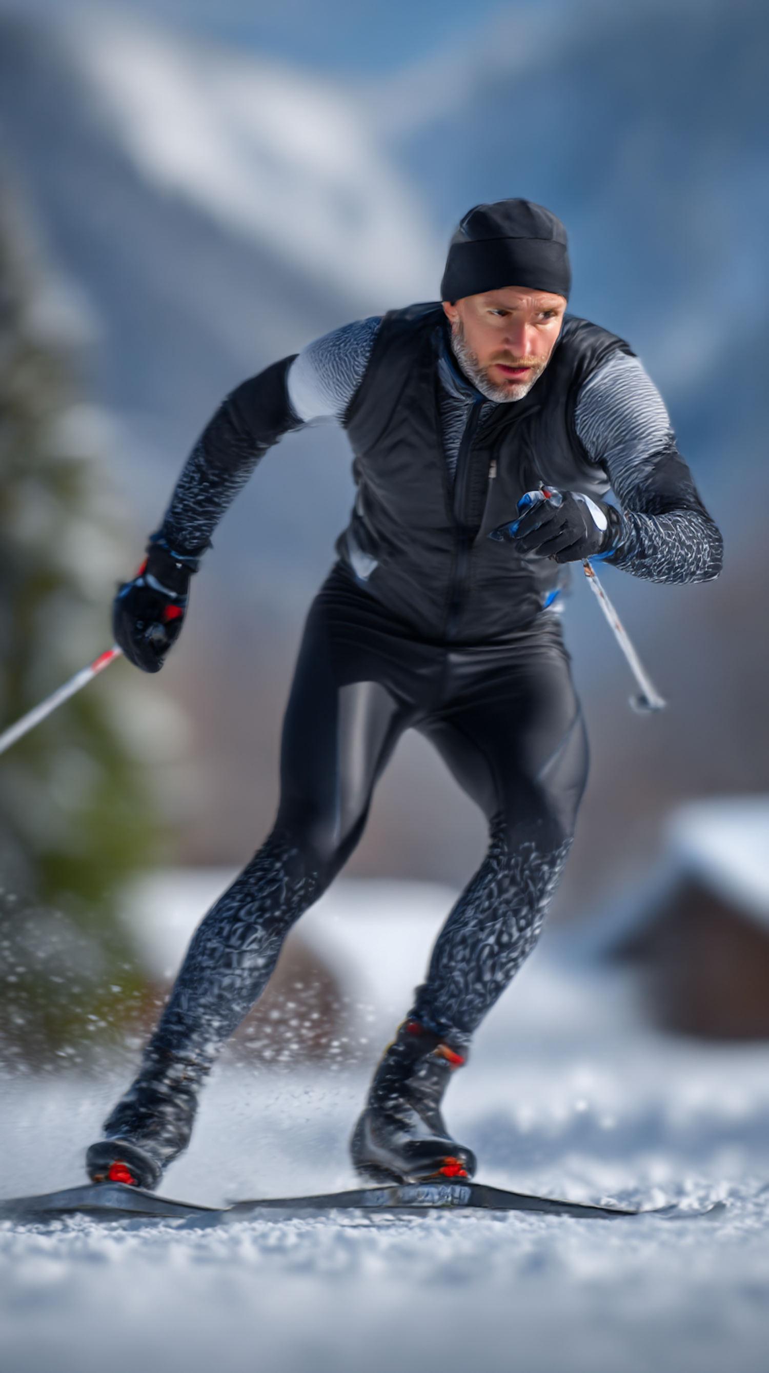 A skier in a sleek outfit glides dynamically on a snowy trail, with a blurred mountain backdrop emphasizing motion and focus.