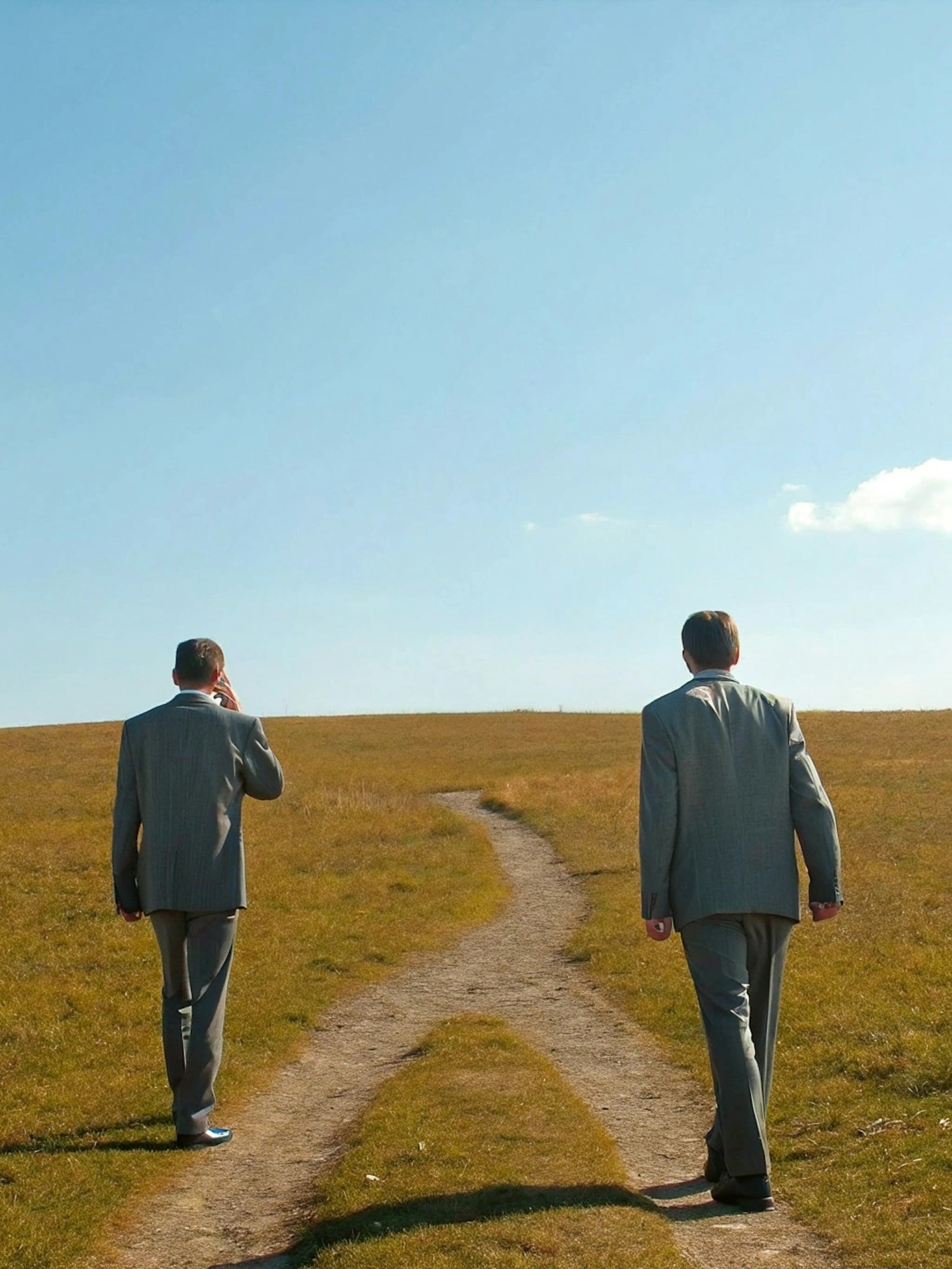 Two individuals in suits walk along a forked path in a grassy field under a clear blue sky, symbolizing decision-making or a journey.