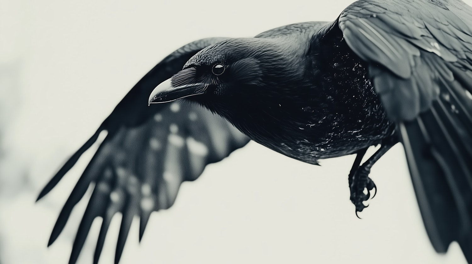 Close-up of a black crow in flight, showcasing detailed feathers and a focused gaze against a light background.